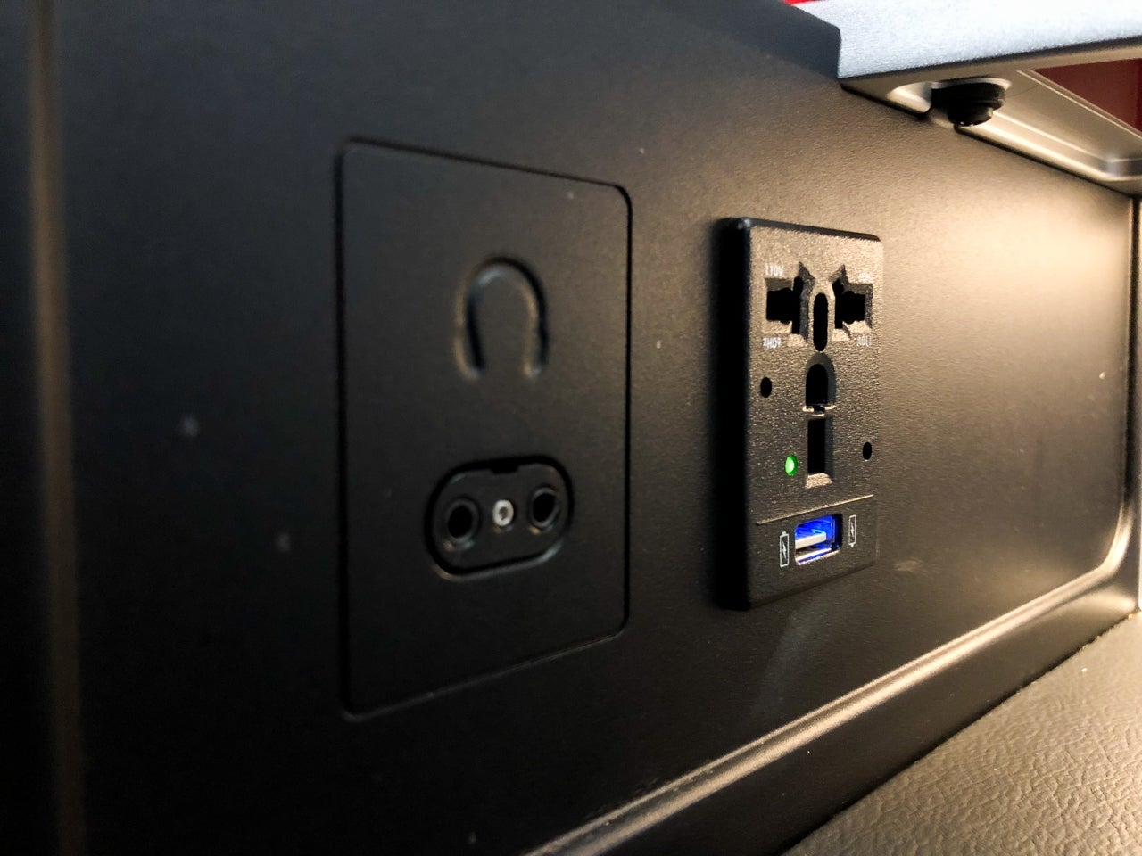 At each Delta One seat was a power outlet and a USB port. Both were next to the headphone port, at the rear of the side table.