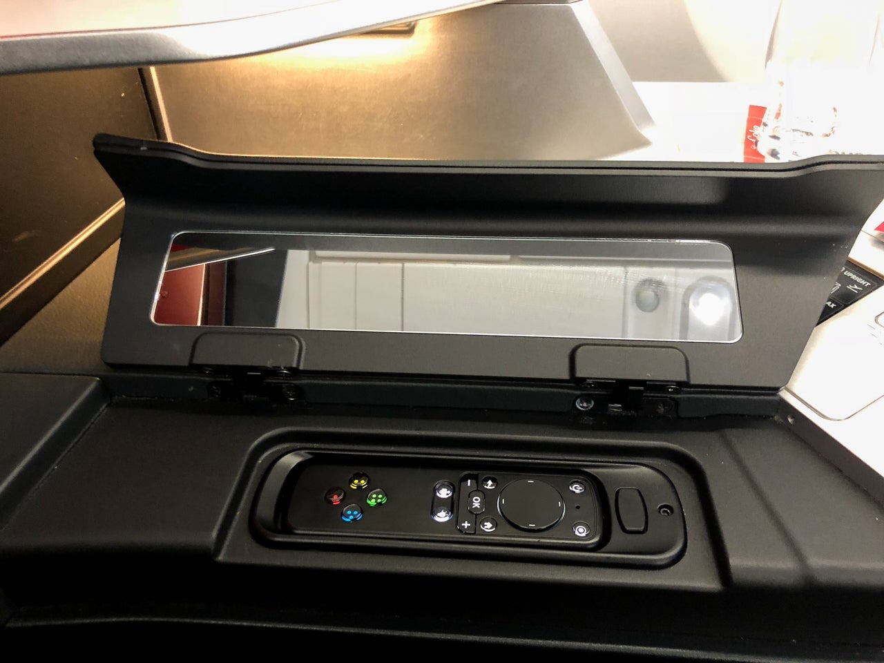 Back inside the suite, one of my favorite components was small but important. The inflight-entertainment remote was stored underneath the armrest closest to the side table. Once it was lifted, a small mirror was revealed. I'm a huge fan of in-seat mirrors, like you can find in Emirates First Class. After — or even during — a long-haul flight like these A350s are designed to fly, having a mirror within reach of your seat is a huge perk. Whether it's checking to make sure your hair isn't crazy after a cozy night's sleep or to see whether there's a piece of spinach stuck between your teeth after meal service, it allows you to scratch off one trip to the lavatory.