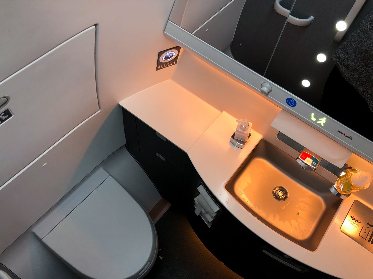 In the Delta One cabin of the A350, there were two lavatories, at the forward of the cabin. The lavs were on the smaller side, the same size you could expect to find in an economy cabin. It was definitely a tight squeeze, though the major plus was that the faucet was motion-activated so you didn't have to worry about touching germy nozzles.