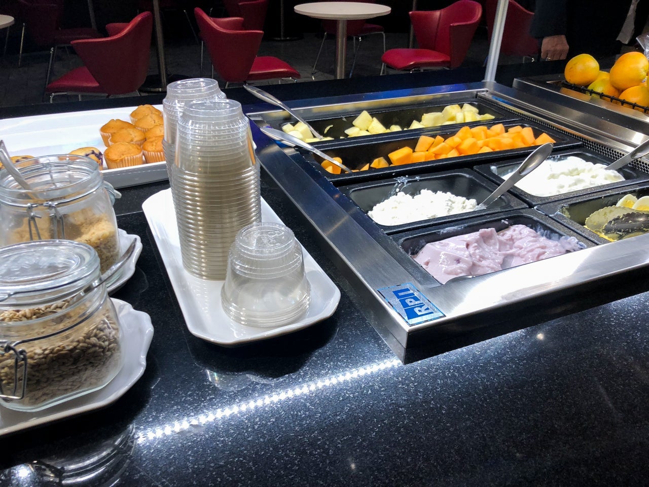 When compared to the offerings from many international carriers, food options were fairly limited. You had the standard fruit and yogurts, as well as bagels and other carb-heavy options. There were also some hot options, which I appreciated — scrambled eggs and warm tortillas being the highlight.