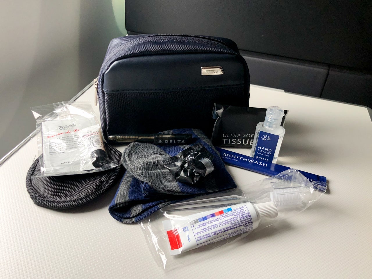 When I did get the amenity kit, it had all the standard goodies inside. There was a dental kit, eye mask, pair of socks, hand sanitizer, pen, tissues, earplugs and Kiehl's lip balm.