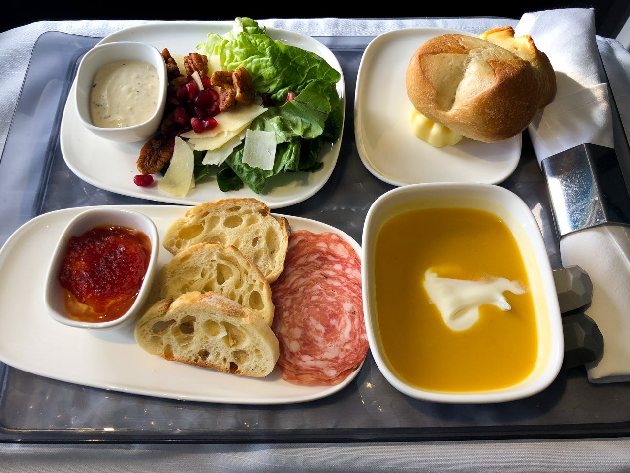 At 3:23pm, appetizers and soup were served. It's worth nothing that there were two versions of the menu: Western and Korean. Like my preselected chicken dish, I chose to stick with the Western menu. Appetizers included finocchiona salami and goat cheese with crostini and tomato jam; a Caesar salad with pecans, pomegranate seeds and shaved Parmesan; and butternut squash soup.