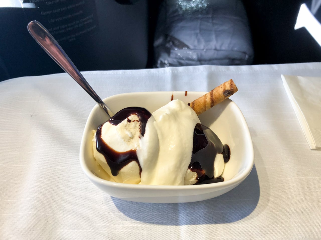 About 20 minutes after the main course dishes had been cleared, a dessert cart made its way down the aisle. Choices included a make-your-own sundae bar, pumpkin cheesecake and fine cheese. Because you can't really go wrong with sundaes, I got that with hot fudge and whipped cream. It was a delicious, sweet way to end meal service.