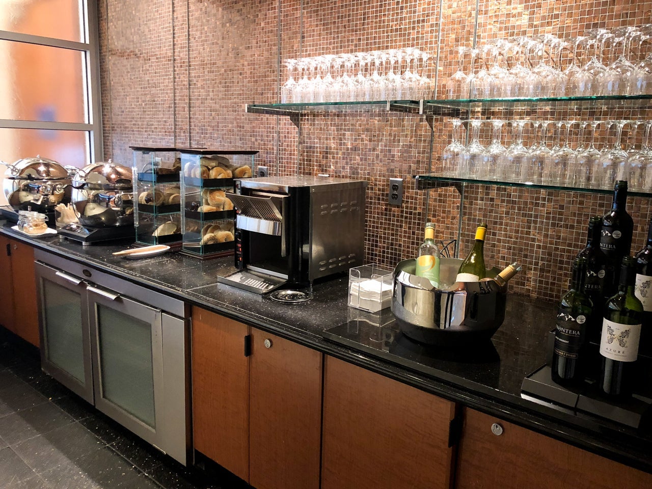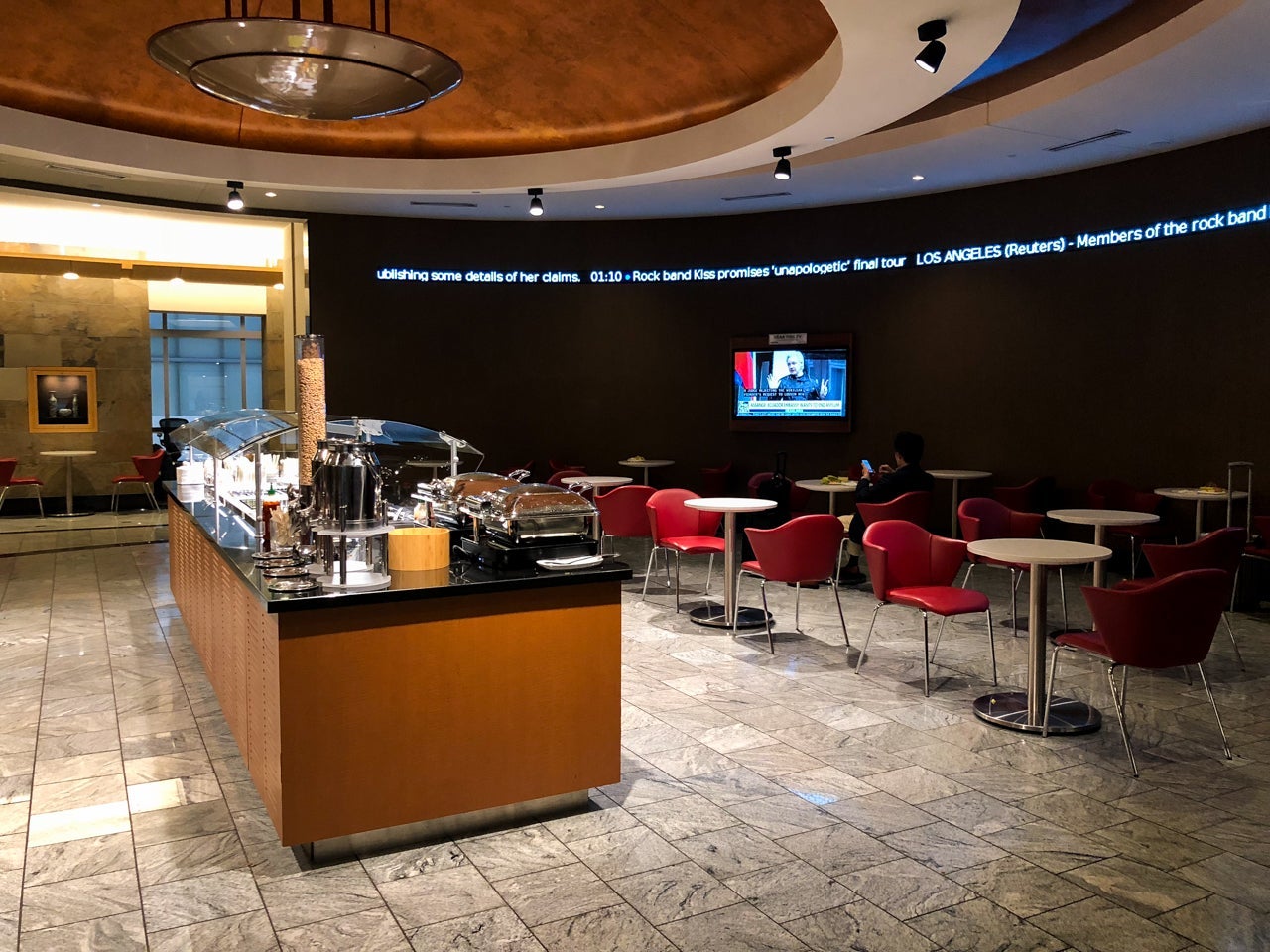 That being said, where the lounge did offer an especially good experience was when it came to the dining. Though not expansive, the space that the buffet occupied had a modern, just-updated look. The floor was bright, accentuated by the spotlight lighting. TVs stationed around the circular room played news ranging from Fox News to NBC and CNN, and a news ticker ran around the perimeter of the room.