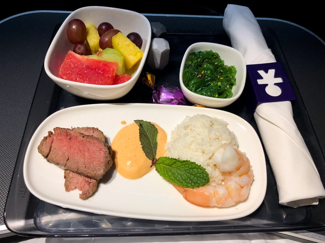 The teriyaki beef and sesame-crusted shrimp was served with mango-coconut rice and sriracha mayo. Both the roast beef and the shrimp were tasty, though I wasn't that hungry. Nonetheless, it was still nice to have a tasty snack in the middle of the flight.
