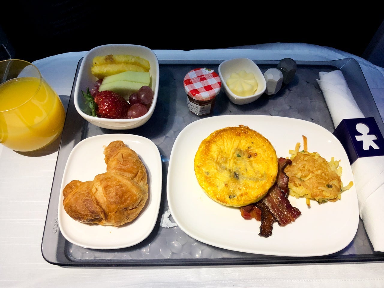 I opted for the frittata, which was actually pretty nice. The egg wasn't over- or undercooked or rubbery, which I've found to be all too common on many flights. The bacon was extremely fatty and greasy, but the hash browns were just right. The accompanying fruit was also fresh and a nice way to round out the final meal.
