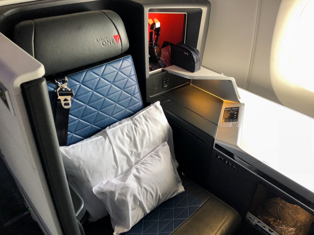 Upon boarding, each of the seats was piled with a set of linens and headphones. While I appreciated having all I'd need for a flight when I boarded, I did get a lot of things on my seat with Delta One. So much so that it begged the question: Where do you put it all?