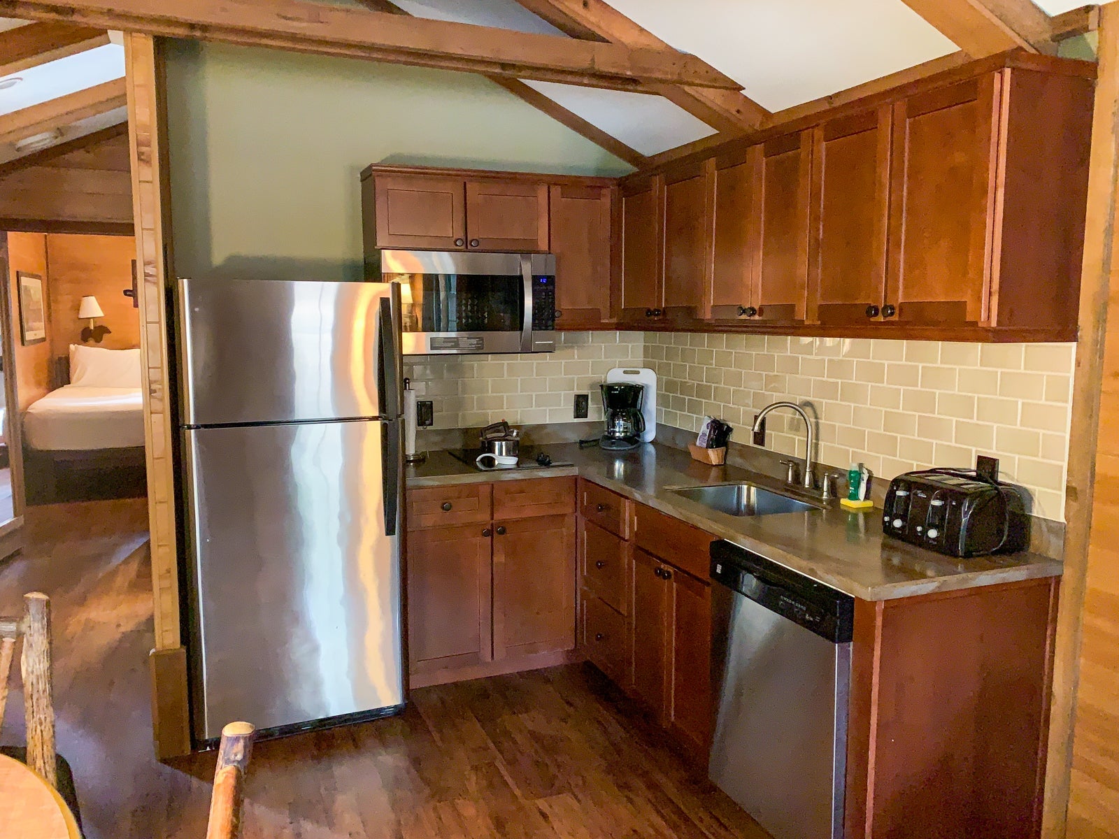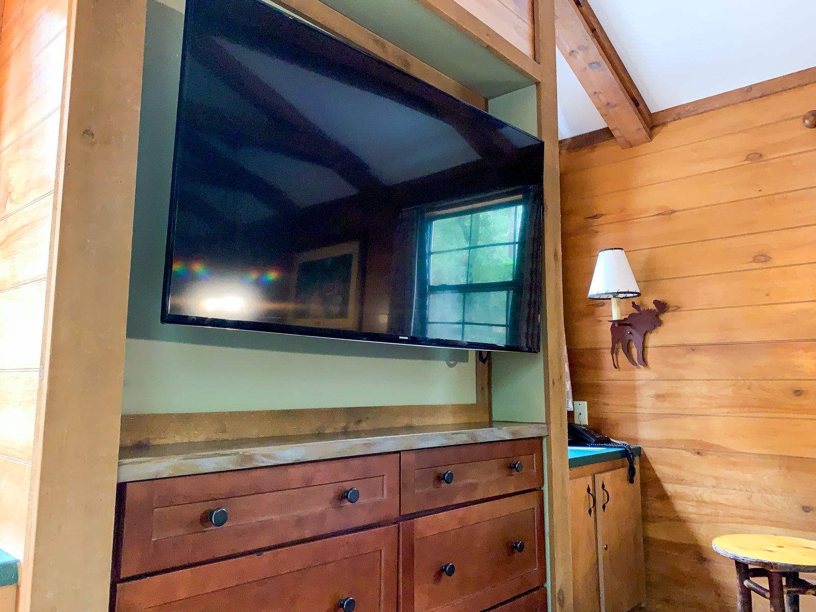 The cabin has a real living room with a pull-out couch, dining table, TV, chair and equipped kitchen.