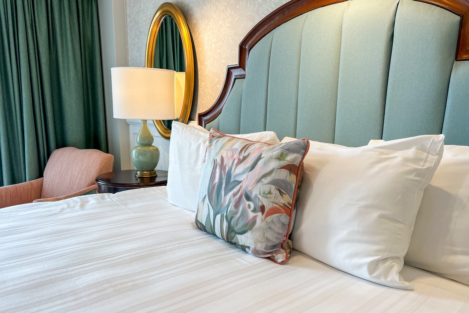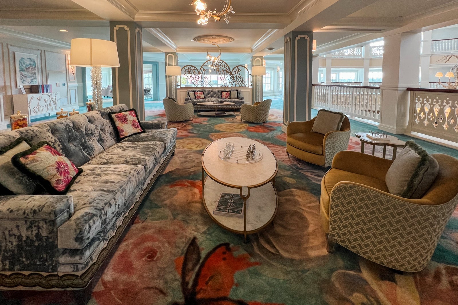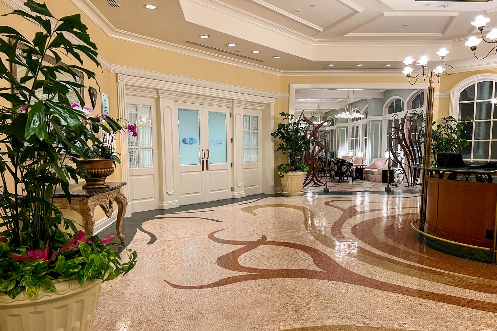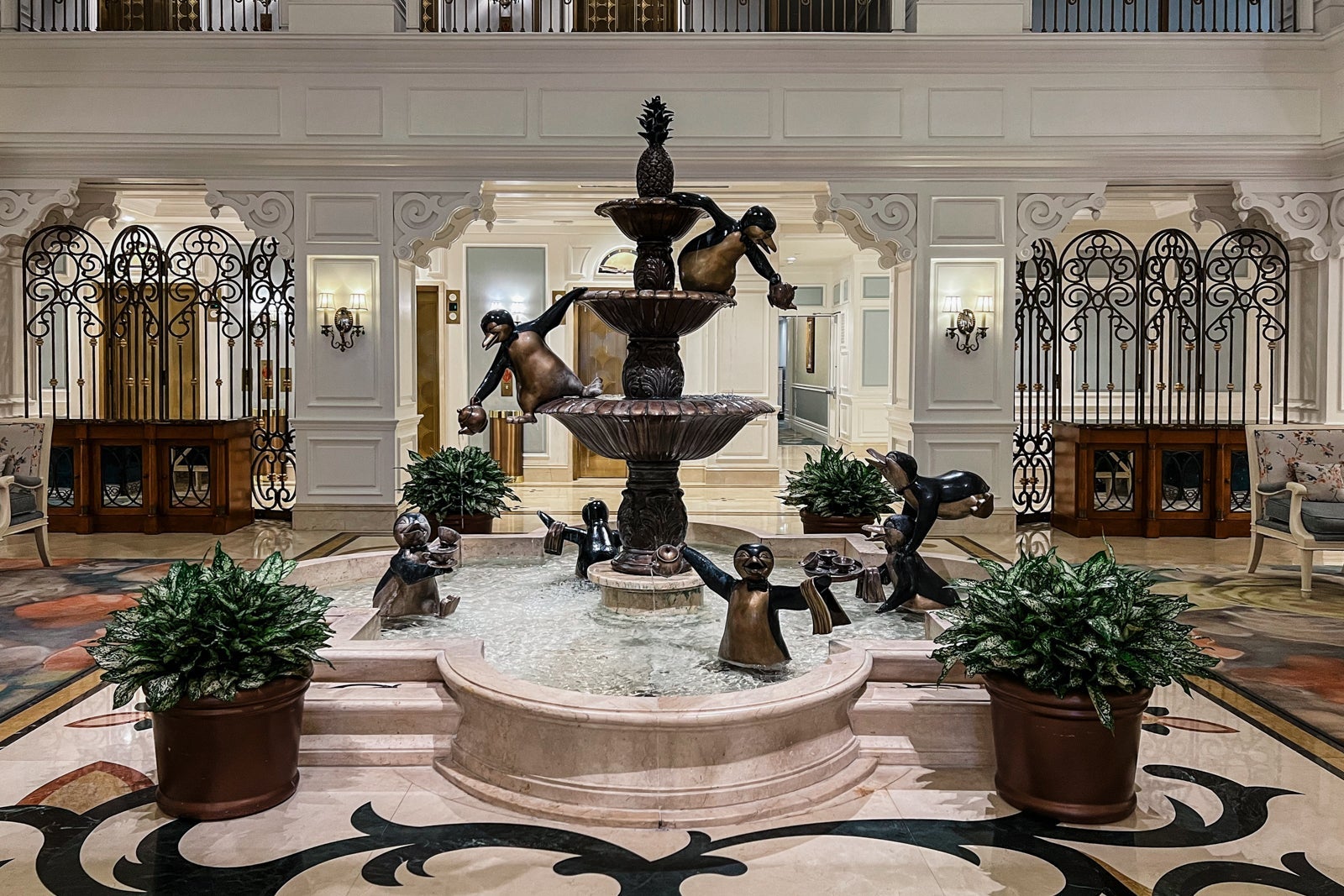 This resort exudes a Disneyized version of turn-of-the-century Victorian charm that leans into the use of light colors, high ceilings, stained glass, chandeliers and marble. There's even a cage elevator and occasional live piano music in the towering lobby to help further set the scene.