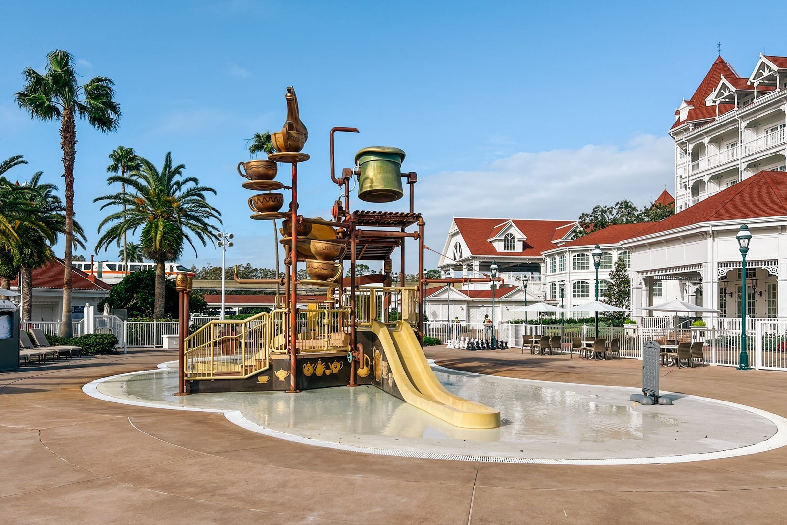 Little kids can also check out the Mad Hatter-themed splash pad play area, which has a small waterslide, water sprays and a big water dump bucket that looks like a hat.