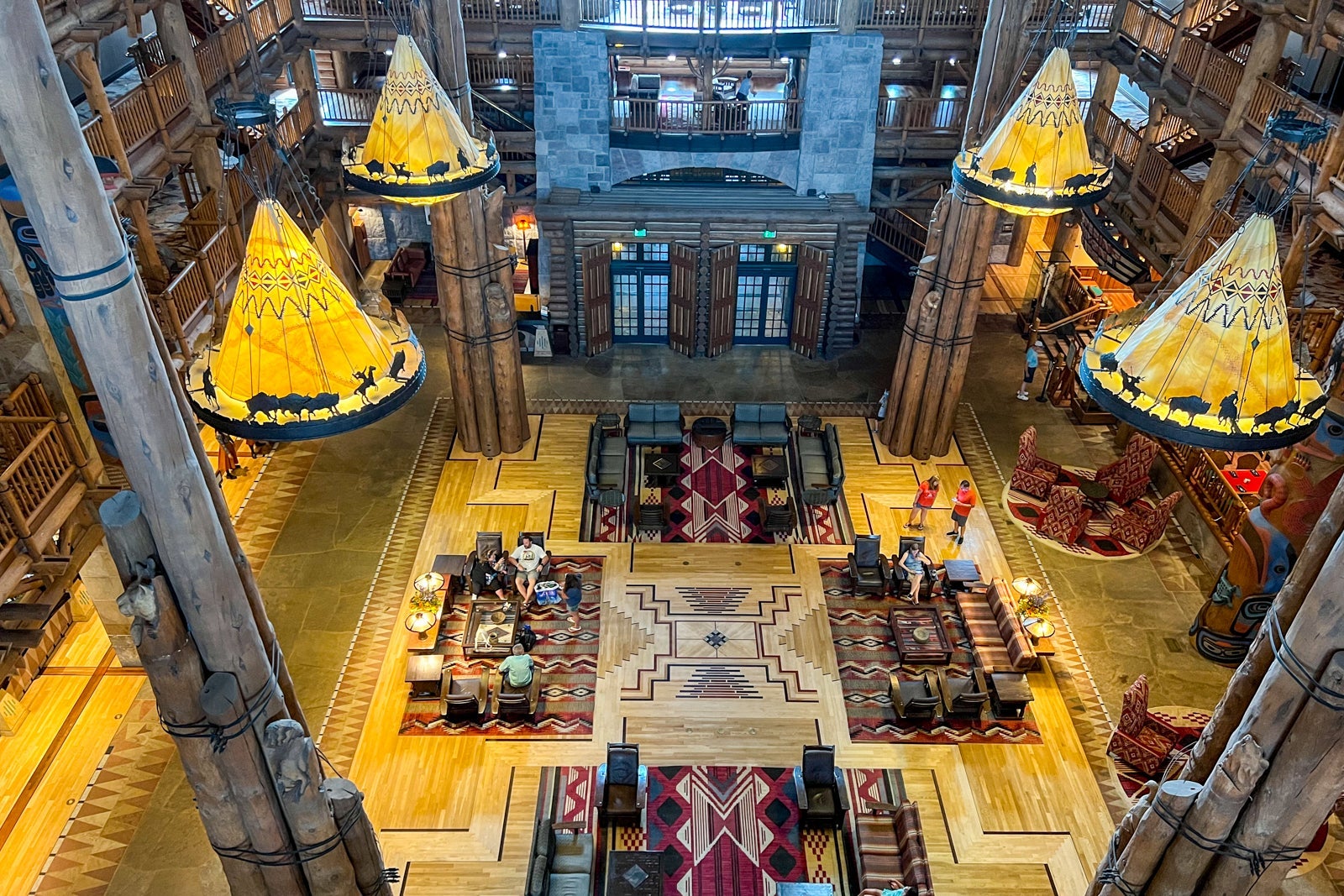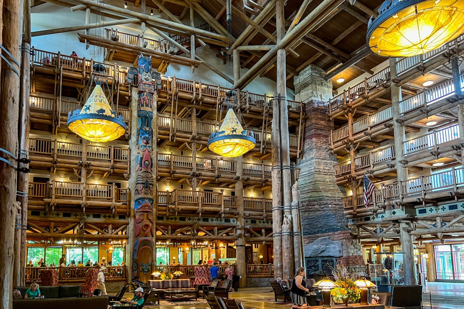 The grandness of the lobby at Disney's Wilderness Lodge is rivaled only by Disney's Animal Kingdom Lodge, which was designed by the same architect a few years after Disney's Wilderness Lodge.