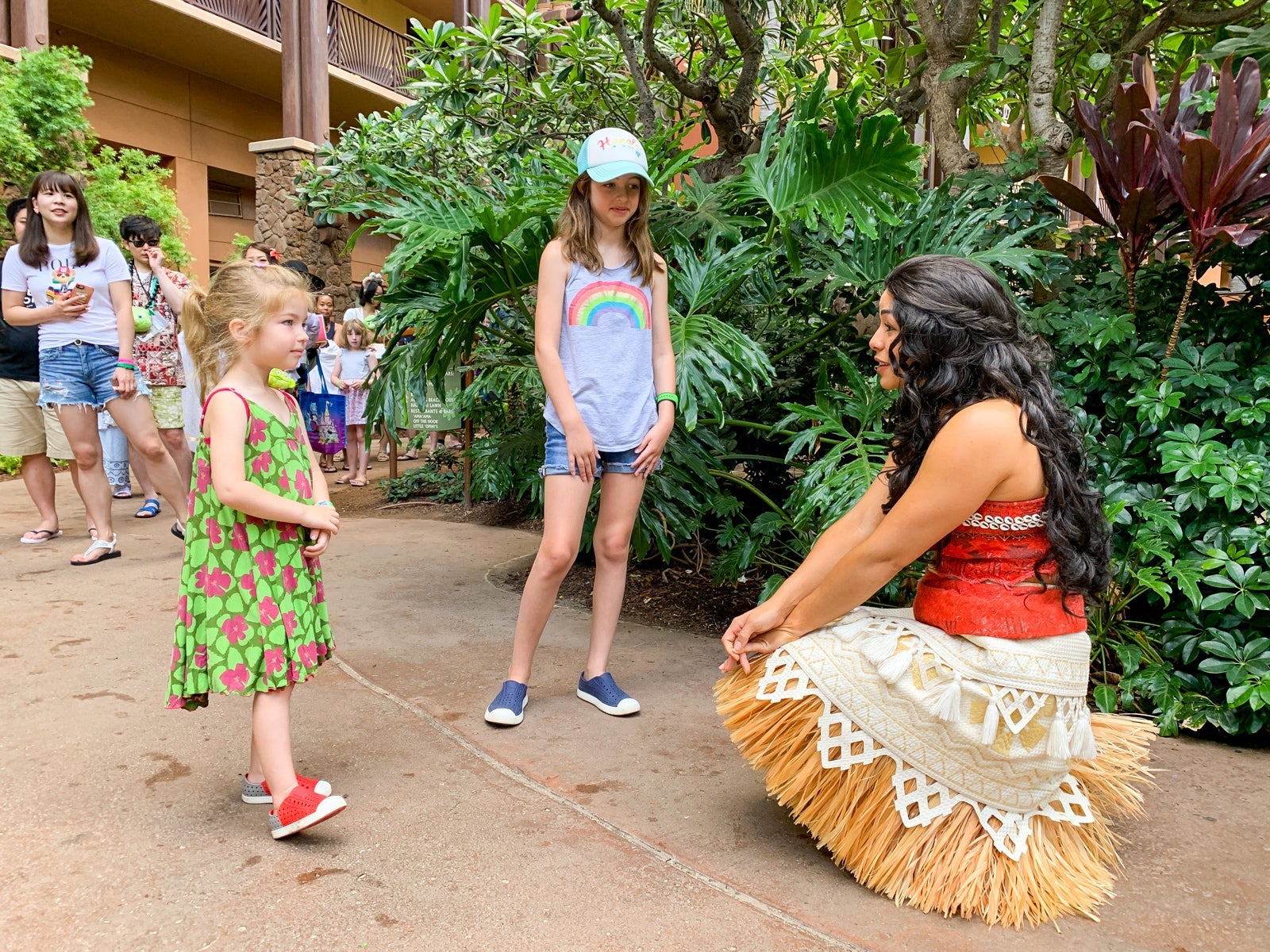 The Aulani app is great for telling you who will be out at different times during the day, so be sure to set it up before you start your trip. We like to line up about 15-20 minutes before the start time for the popular characters.