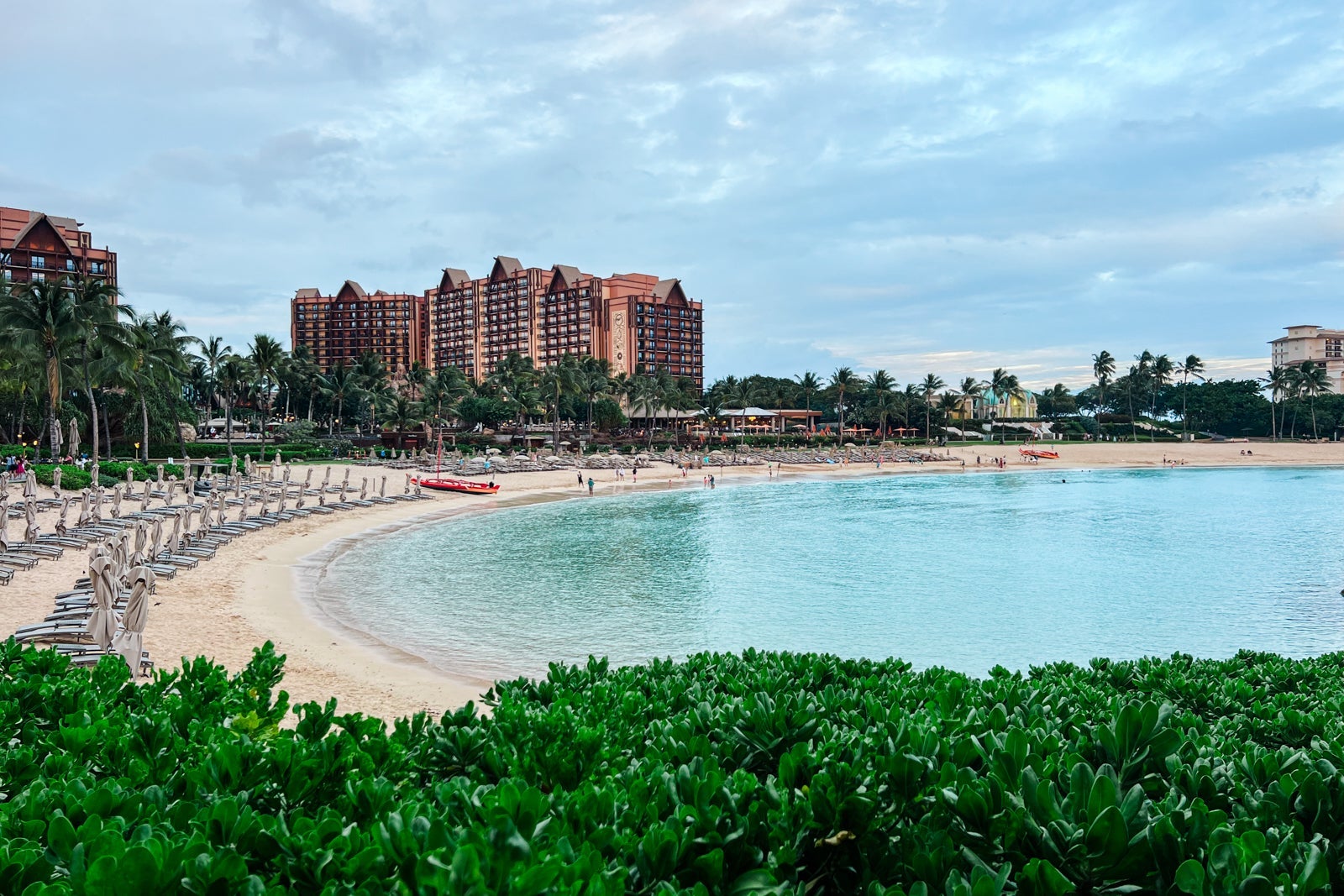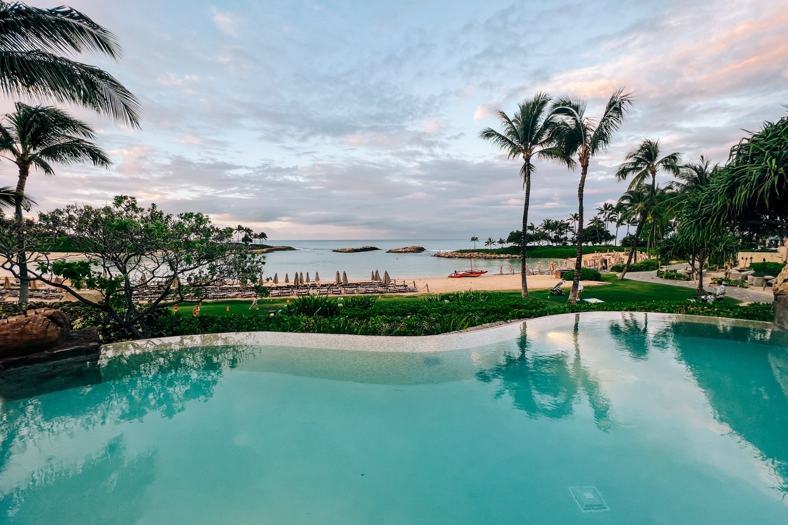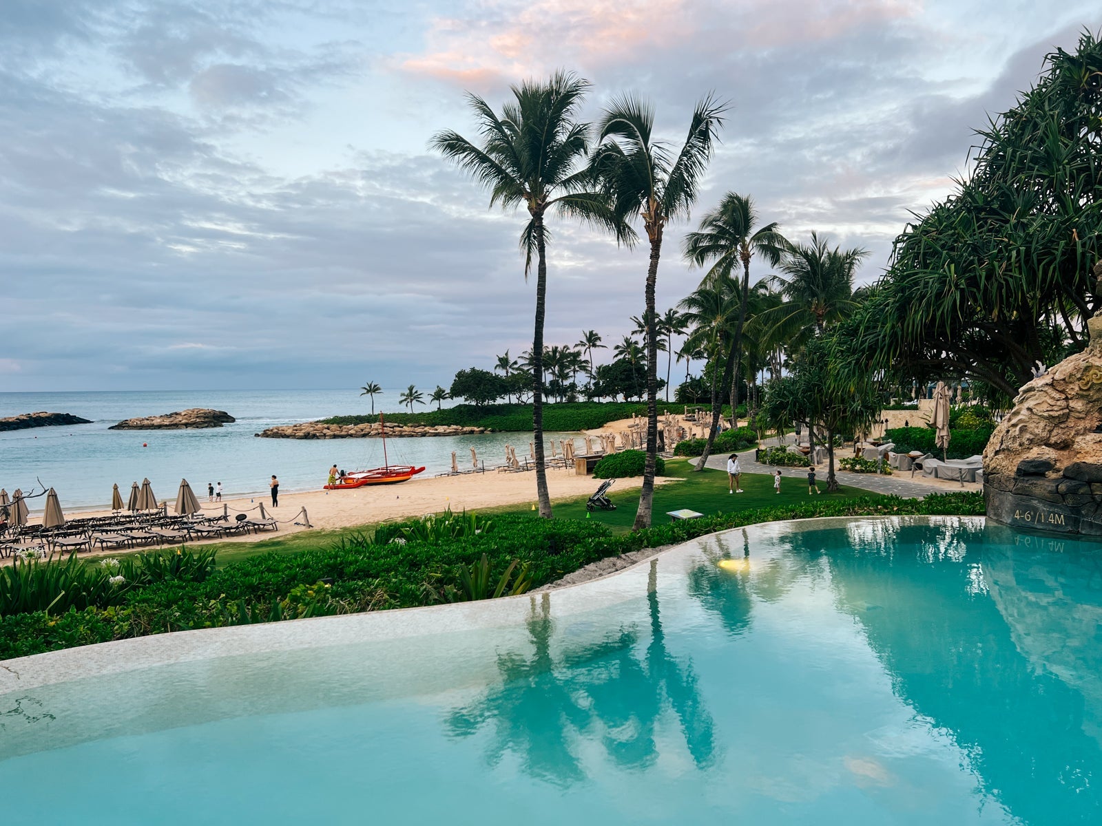 Aulani is on the shore of Ko Olina beach, with soft sand and water that is generally calm enough for swimming and ideal for photos.