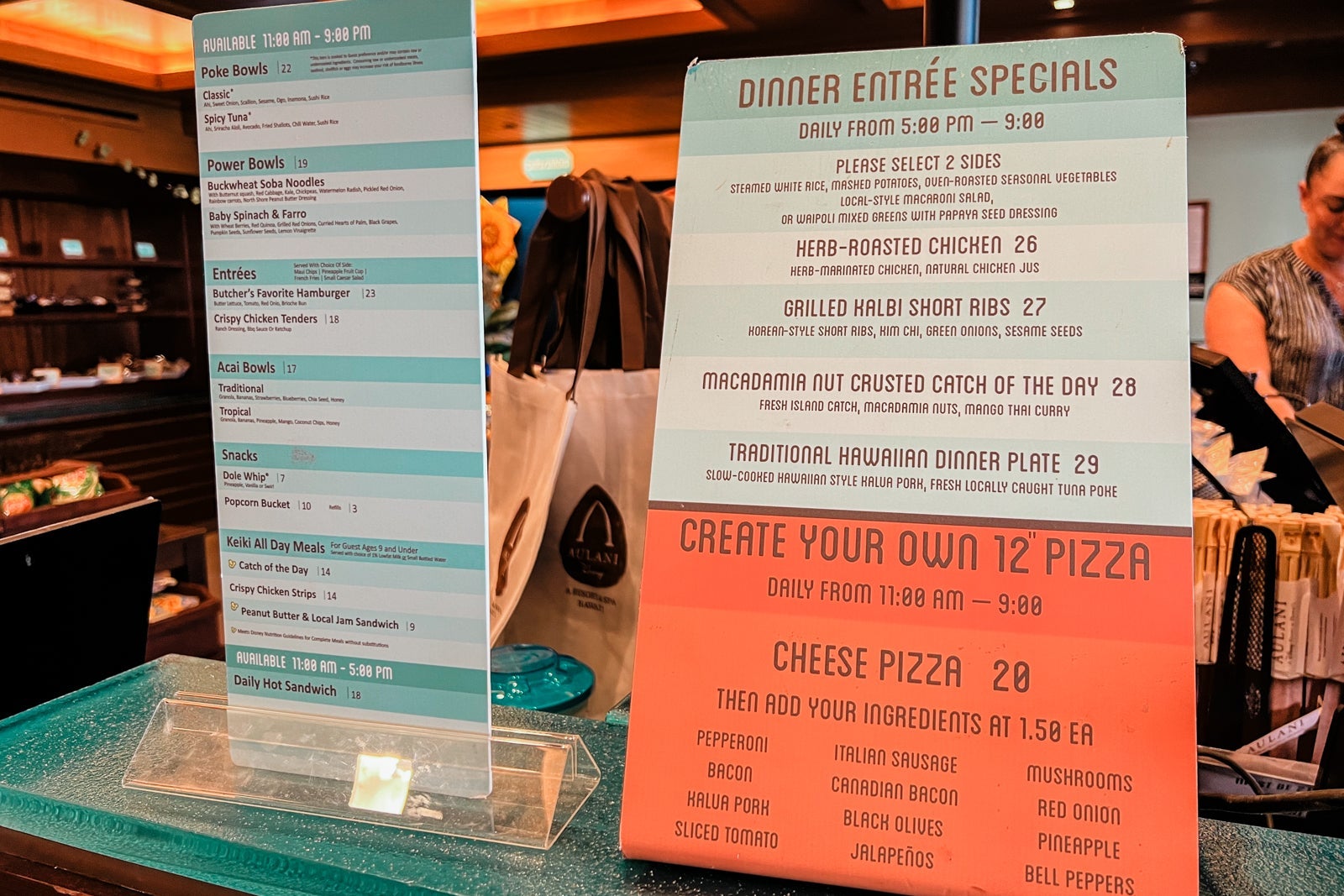 For a meal that doesn't top $100 for two people, head to Ulu Cafe, which is where we've enjoyed most of our Aulani meals over the years. This quick-service and grab-and-go venue had an assortment of pastries, muffins, drinks and packaged goods in addition to a few hot items at breakfast, lunch and dinner.