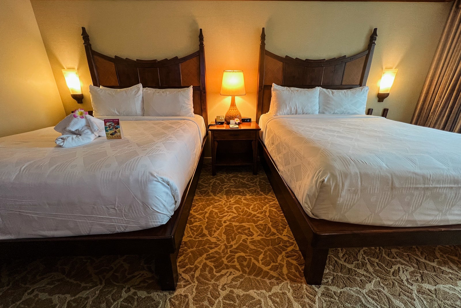 Aulani has 351 hotel rooms, including 16 suites, as well as 481 two-bedroom Disney Vacation Club villas and 21 Grand Villas spread out over a couple of towers. We have done both of our stays in one of the standard hotel rooms with two queen beds.