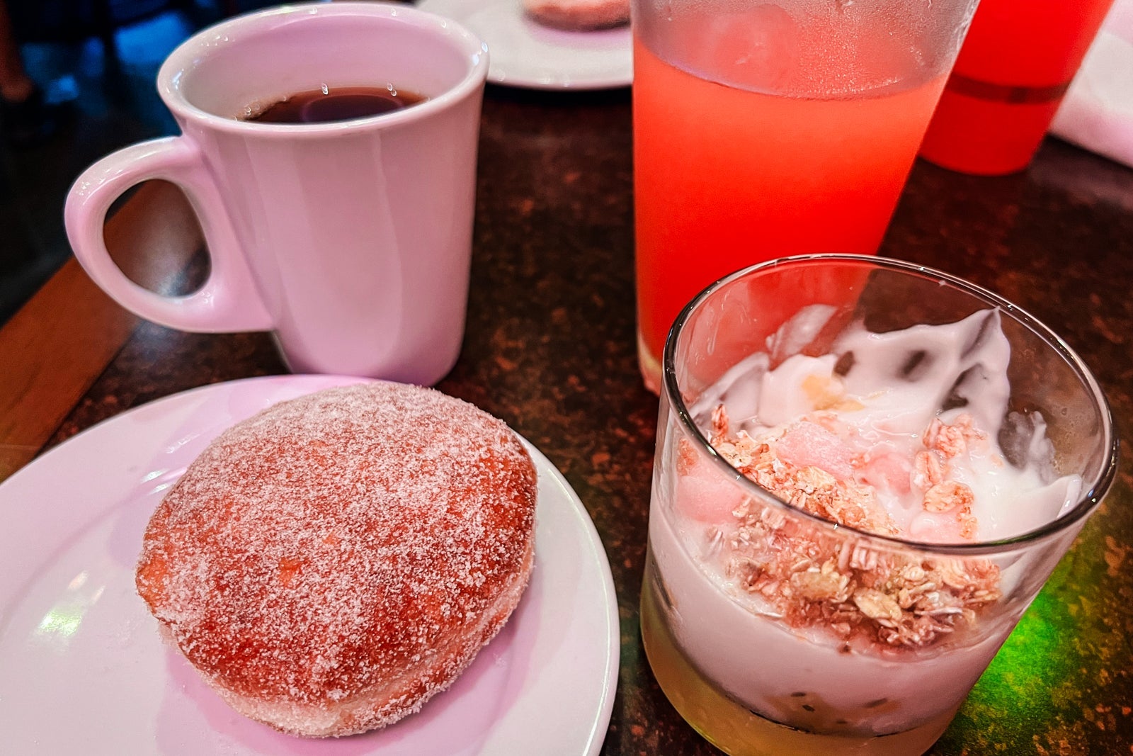 This is a three-course breakfast that starts off with a tropical yogurt parfait with fruit such as coconut and pineapple, along with sugary and absolutely delicious malasadas.