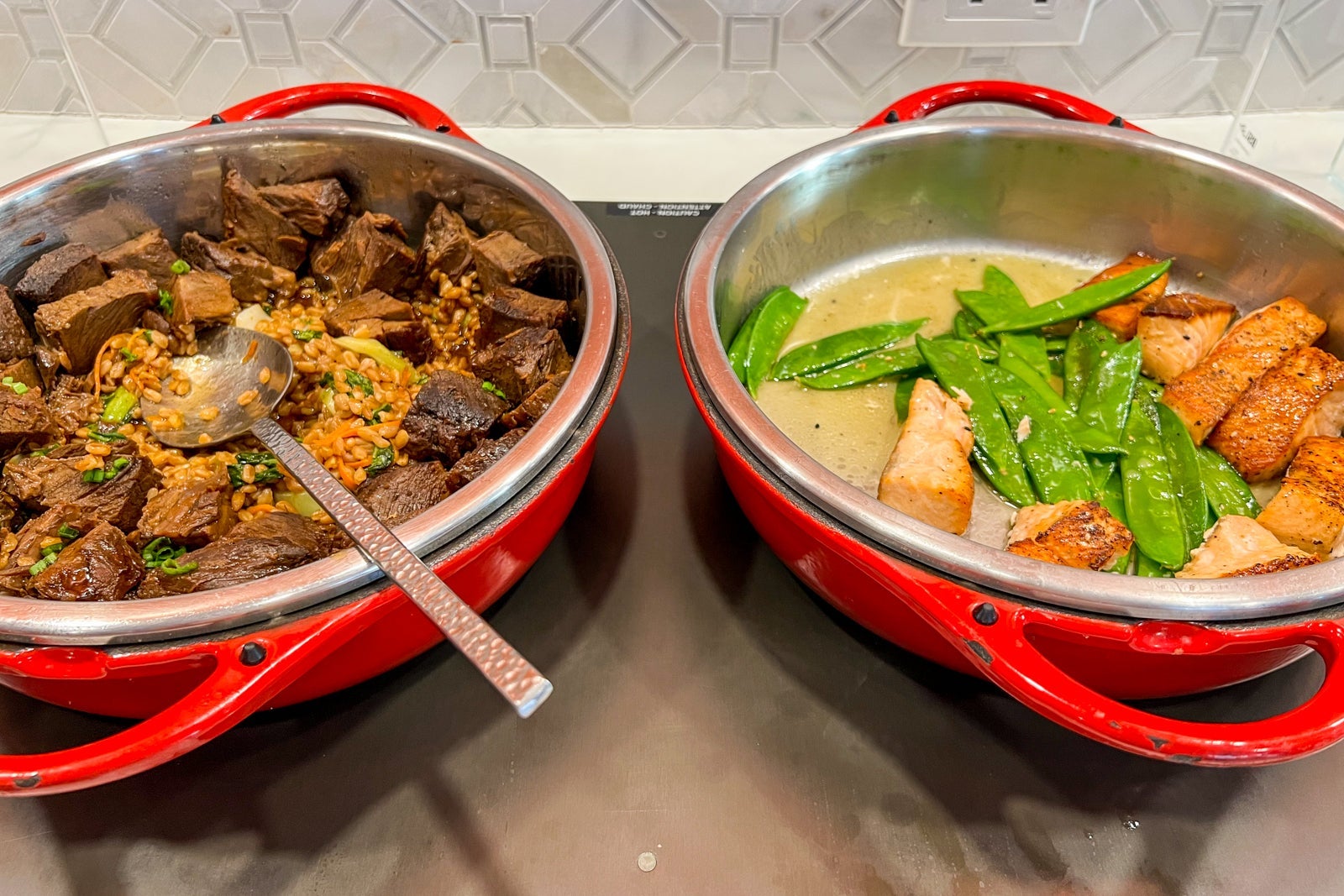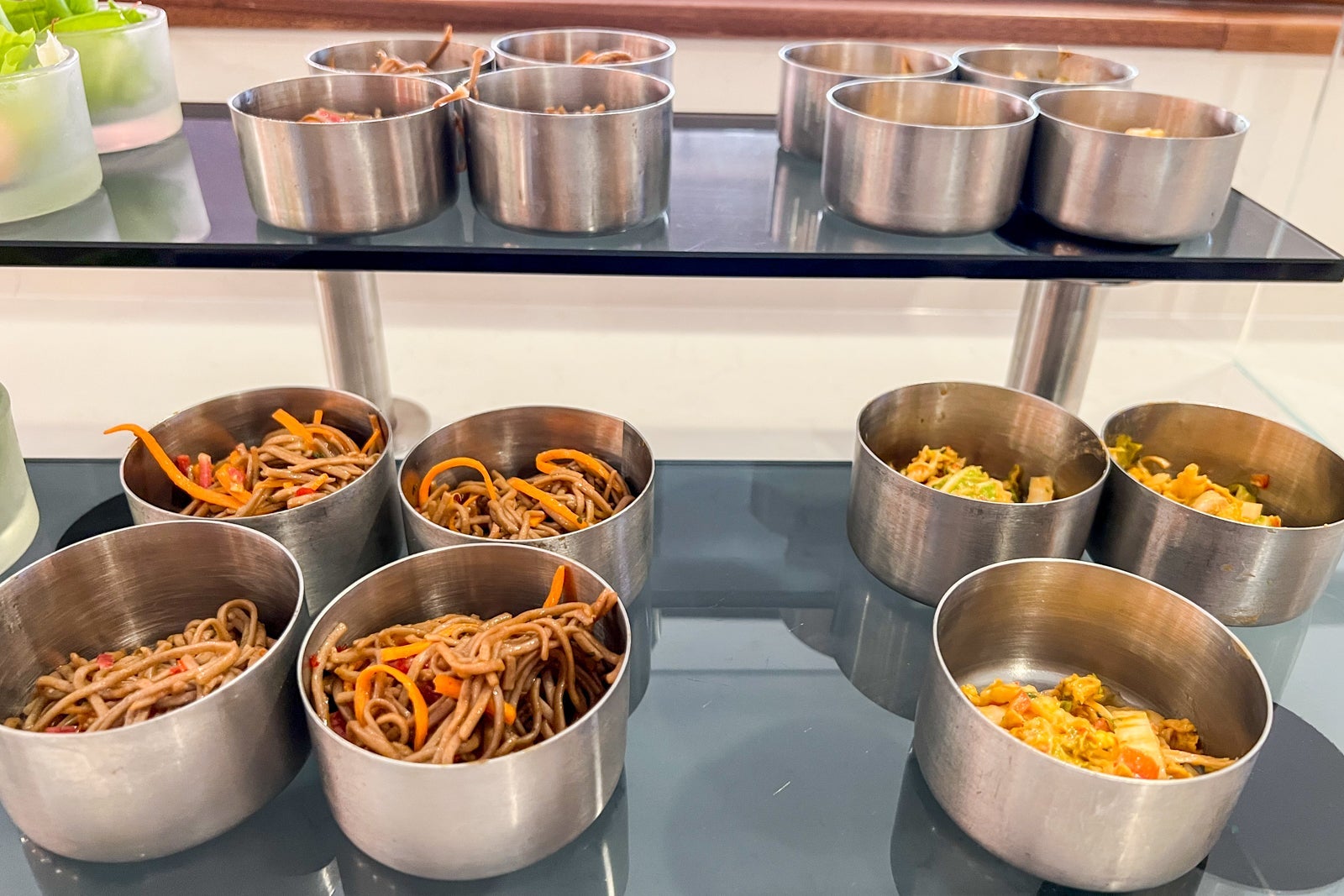 While we were here, the evening spread consisted of miso-braised short ribs, honey- and soy-glazed salmon, tater tots, corn dog nuggets, a meat and cheese spread, buckwheat noodles, lemongrass shrimp and a delicious Thai peanut chicken salad.