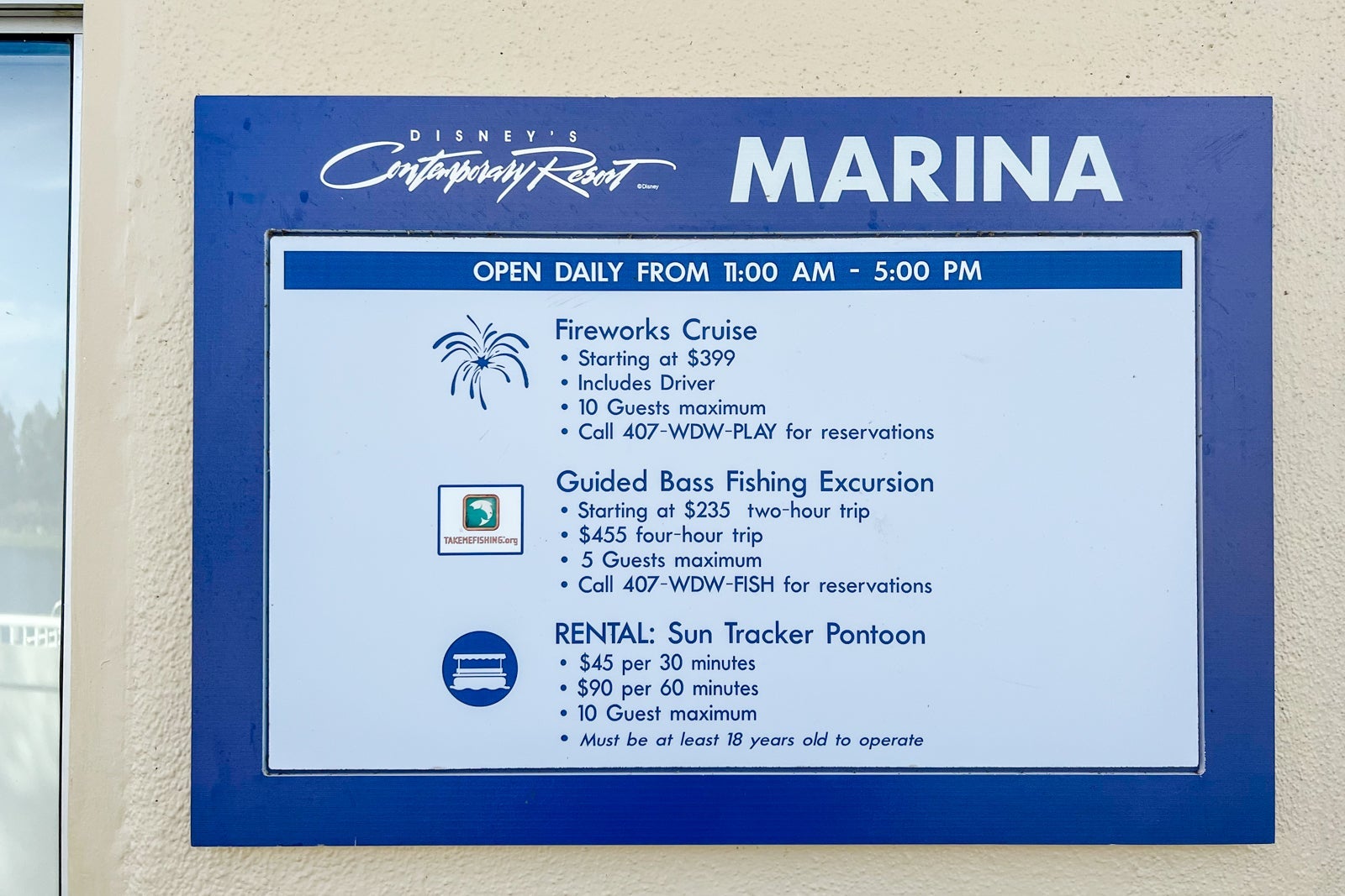Because of its location right on Seven Seas Lagoon, the Contemporary offers boat rentals to guests. Each Sun Tracker Pontoon boat can seat up to 10 guests and is available for $45 per half-hour.