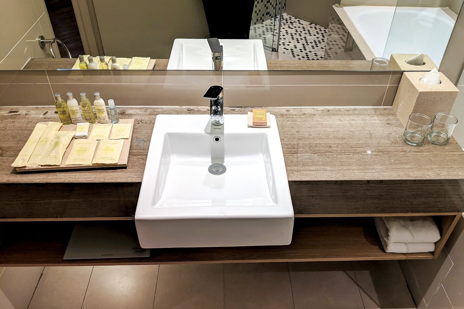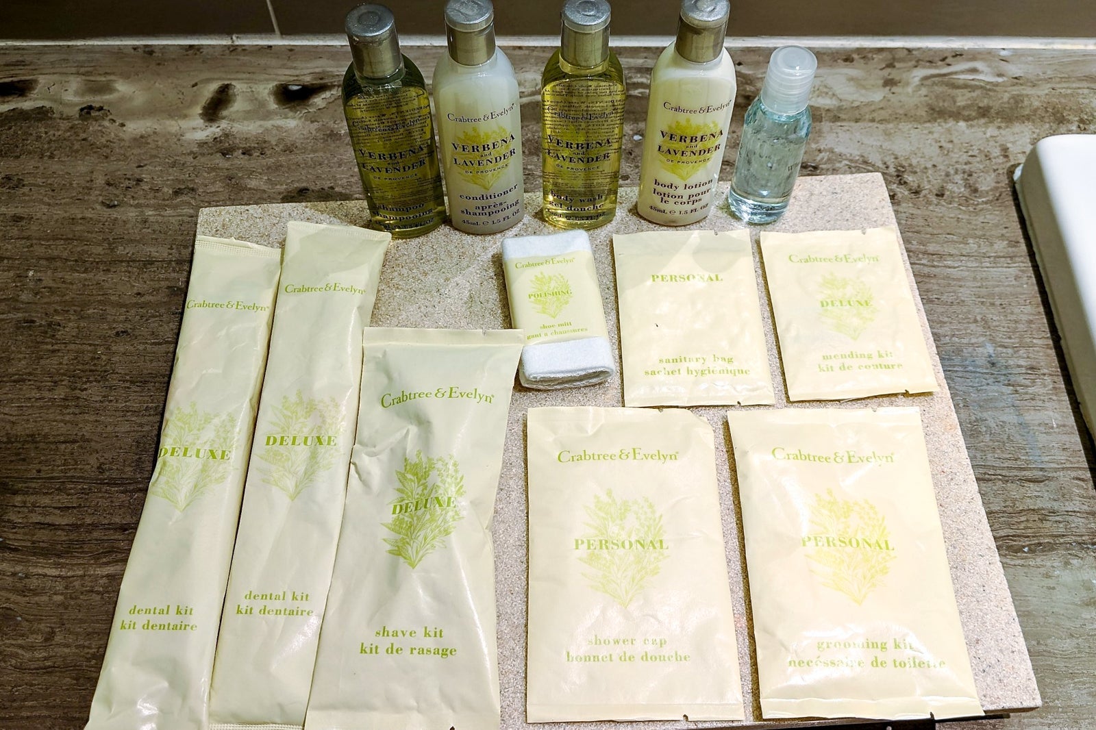 Crabtree & Evelyn amenities were available on the counter, although the large pad seemed like an inefficient way to display all the amenities. Below the sink were hand towels and a scale.