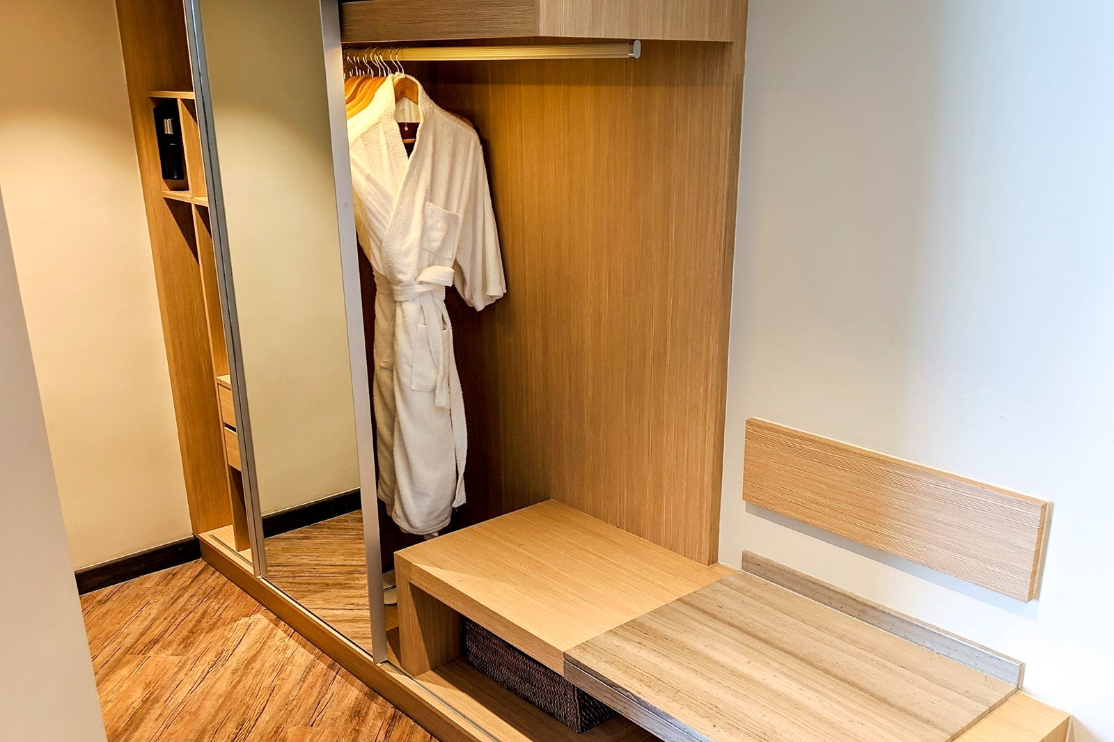There's also a closet nook and luggage rack located in a corner of the bedroom. Strangely, the hotel decided to put the hair dryer in one of the drawers in this nook -- I didn't find this out until I called the front desk for a replacement.