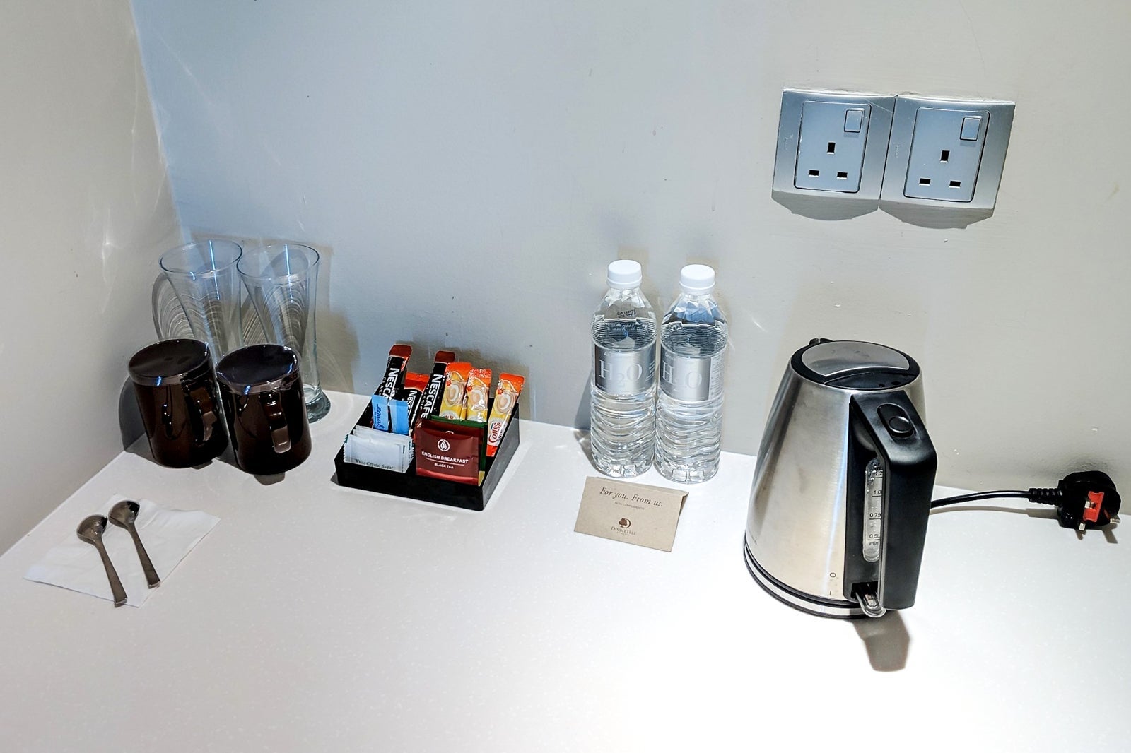 In the corner of the living room is a coffee nook. A water kettle, bottled water, tea and coffee were provided.