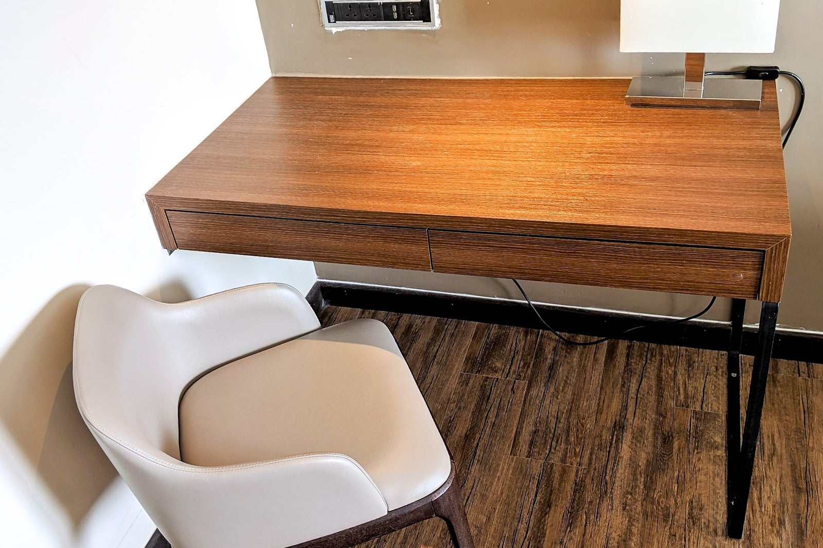 A small desk is located in the corner of the bedroom. I found the desk comfortable for working. The electrical panel above the desk seemed, I hope, to be in the process of being repaired or replaced.
