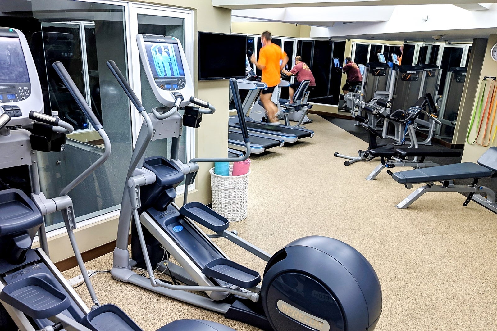 There is a fitness center and spa on the first floor. The spa menu -- which is available online -- includes spa packages, massages, body treatments, facials, nail treatments and kid's treatments. The spa is open daily from 10am to 10pm. The fitness center features pool and ocean views. It is an older facility with two elliptical machines, three treadmills, two exercise bikes, five weight machines, assorted exercise balls, various free weights, yoga mats and small lockers.