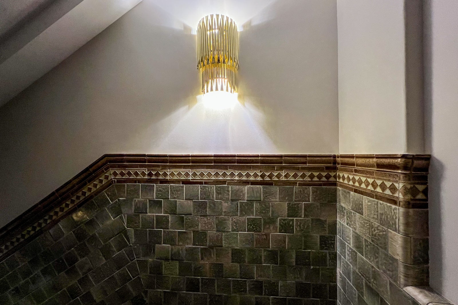 On the second floor, where the hotel's restaurant is located, the walls are decorated with original glazed tiles in cream, gray and green.