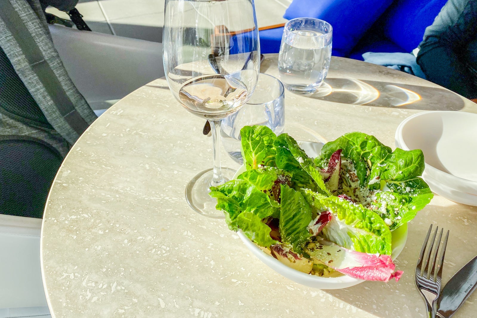 The Roof also supplied the food for the adjacent pool. One afternoon, I ordered a crudités platter ($20), which was served beautifully with a white-bean hummus on the side, an order of blistered shishito peppers ($14) and that trusty Caesar salad. It was all delicious, though nothing at this property was cheap.