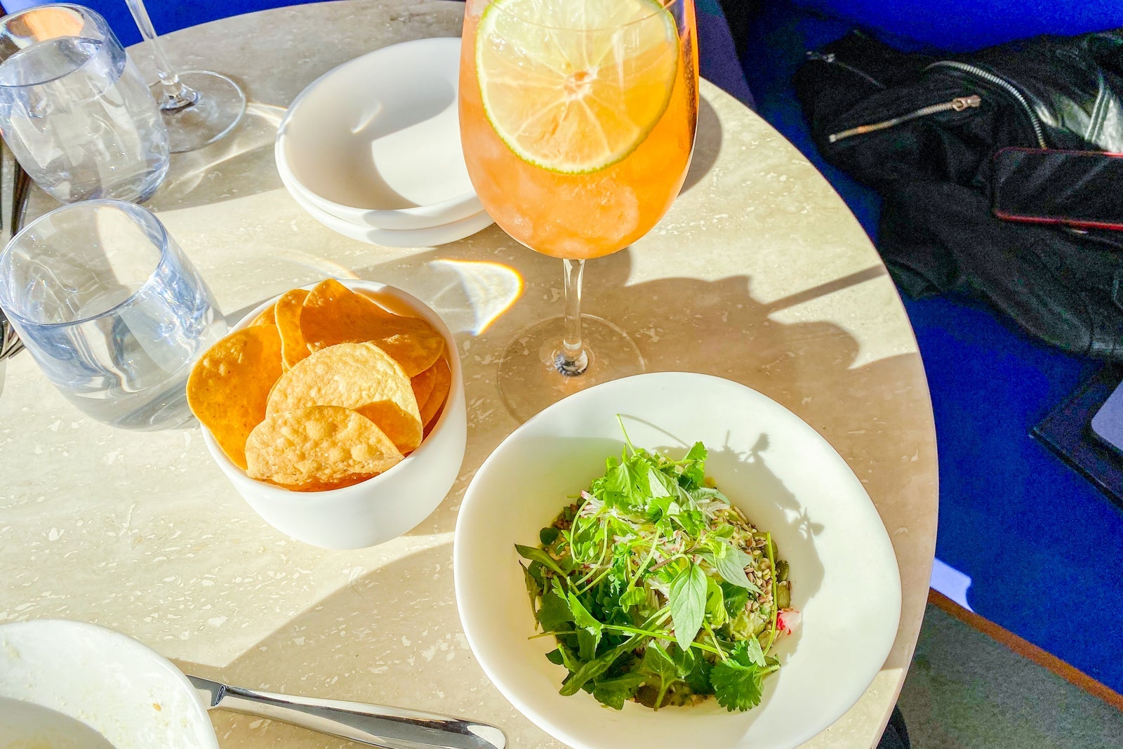 My favorite cocktail was the Lethal Weapon, which was made with Gem & Bolt Mezcal, Aperol, lime, dry Curacao and rhubarb. I love mezcal, and this drink was delicious and refreshing, though it didn't feel particularly boozy. I guess the only truly lethal thing about it was its cost — $20, to be exact. I enjoyed this with some of the hotel's guacamole and chips ($12), which is pretty much my favorite snack to have anywhere.