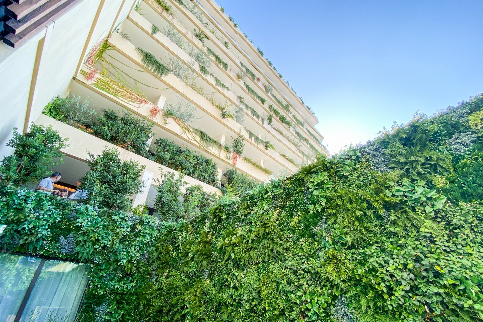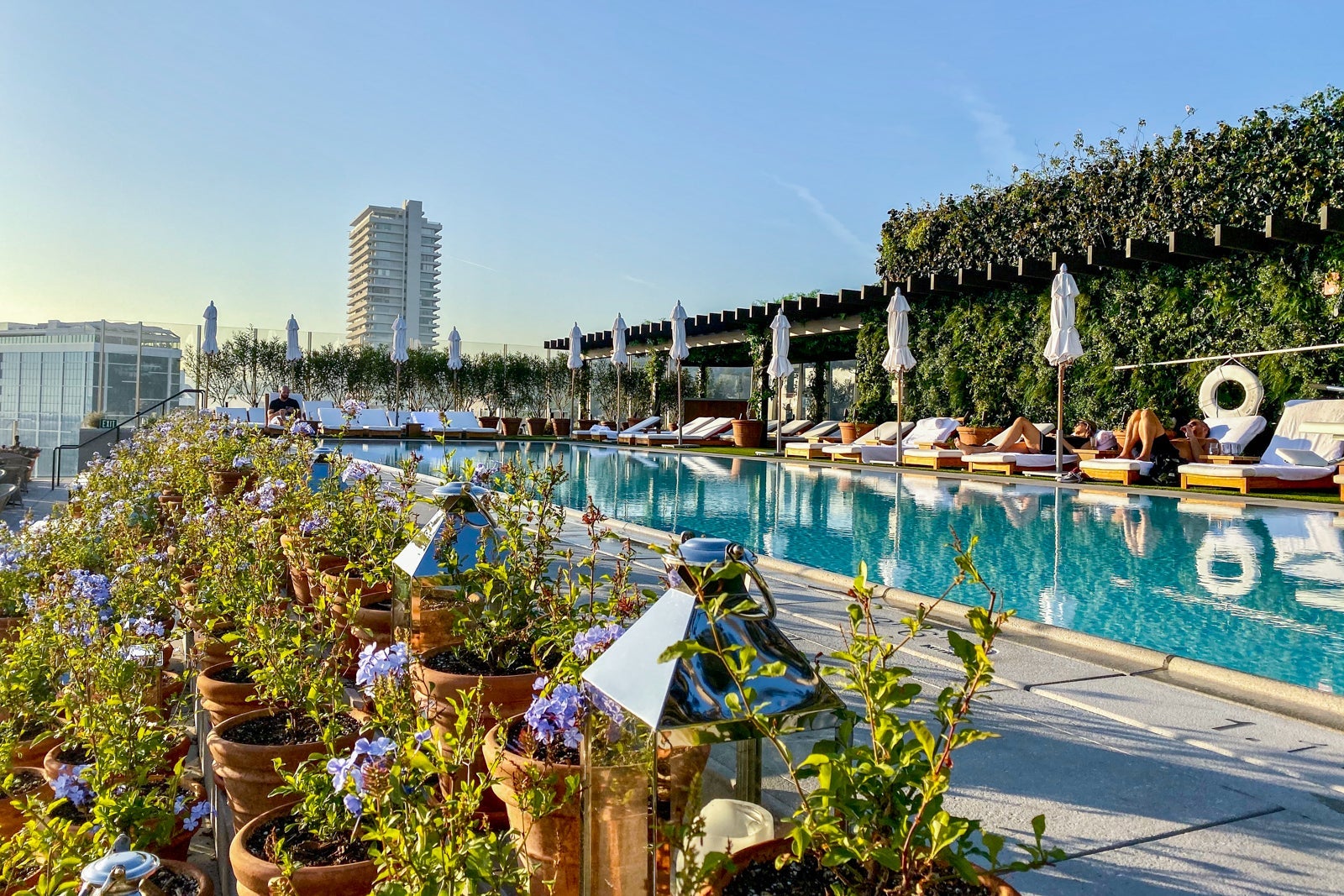 The immediate pool area was surrounded by artificial grass, but it was softer than what you'd find on, say, a football field. Between the pool and the dining tables adjacent to the roof's glass wall were a number of steps, most of which were covered by another signature Edition flourish: tons of potted plants.