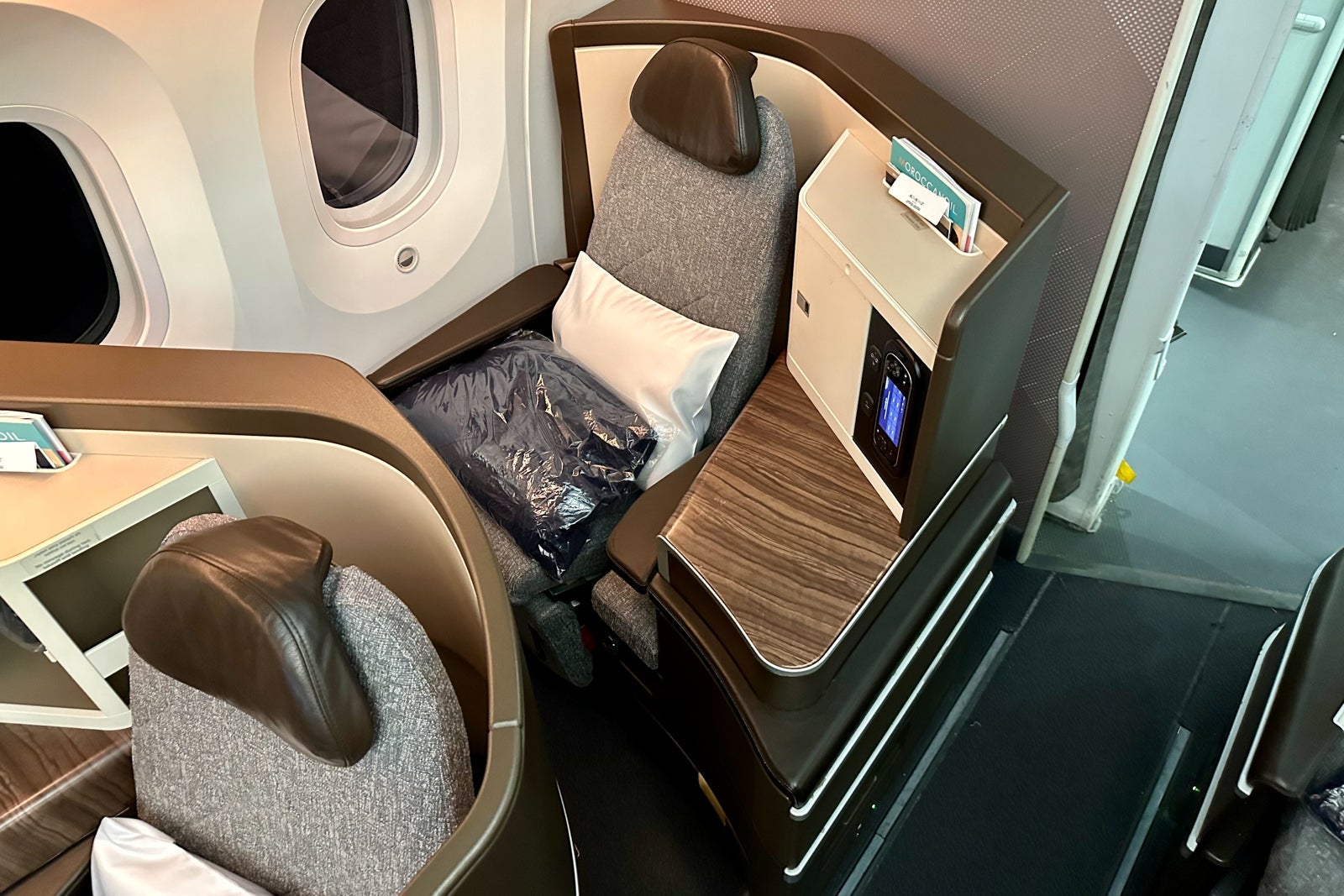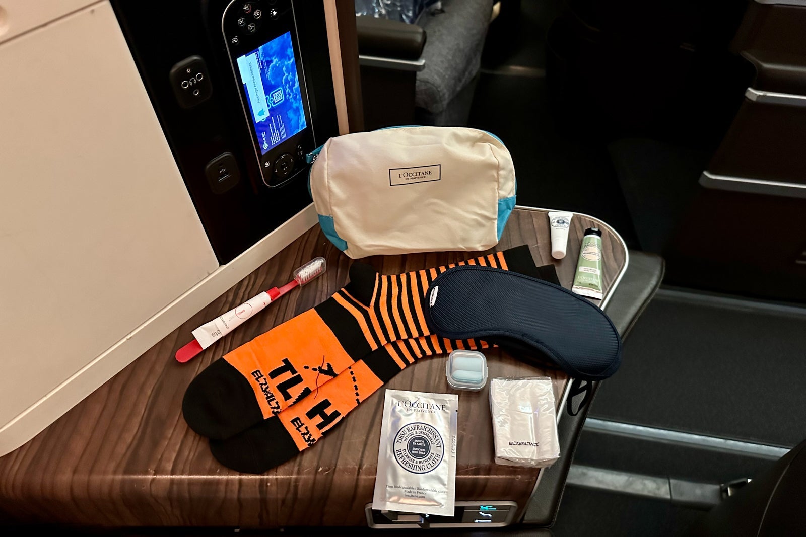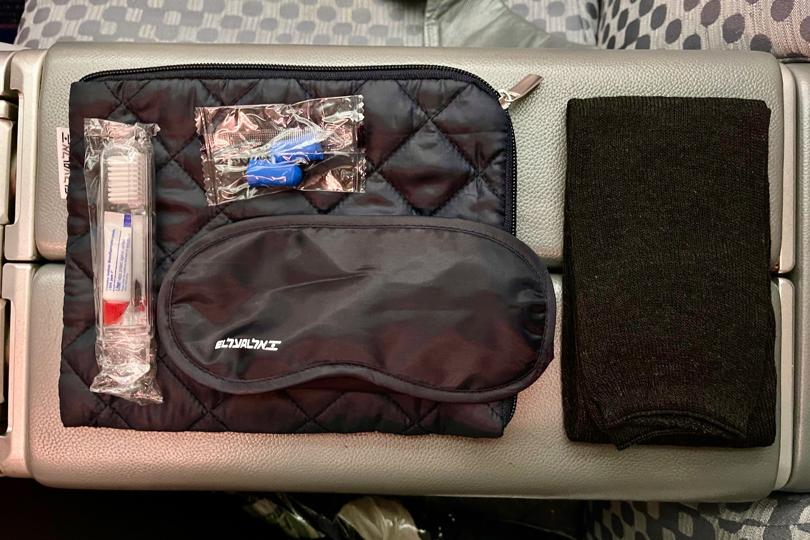 When I flew the route back in 2020, I received an unbranded amenity kit, stocked with socks, earplugs, a toothbrush and an eye mask.