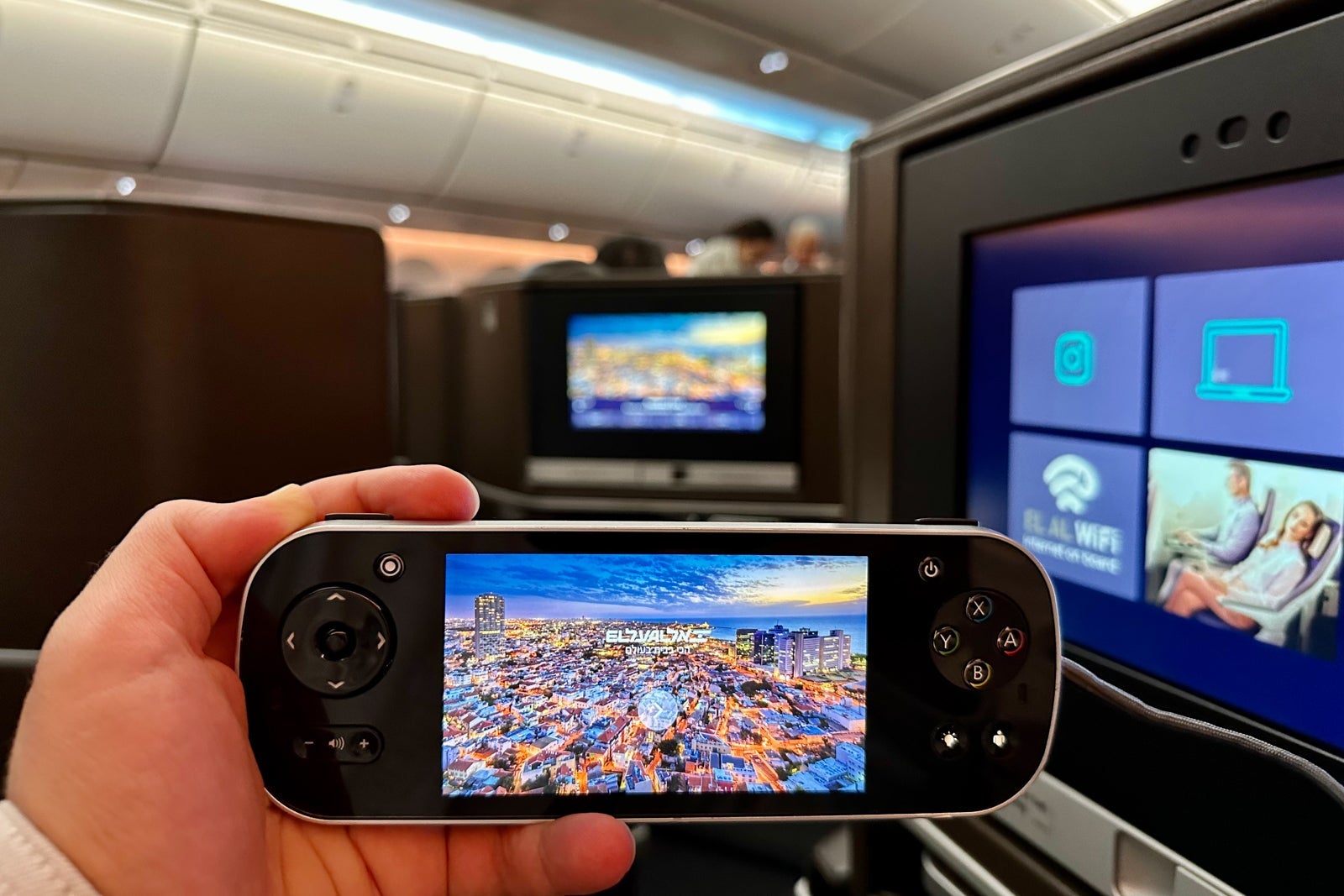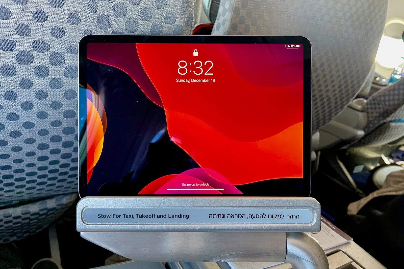 El Al's 737s don't have built-in seatback entertainment. Instead, the carrier installed tablet stands in business class that fold out from the center console. Those sitting at the pointy end of the plane receive an iPad loaded with movies and TV shows for use during the flight.