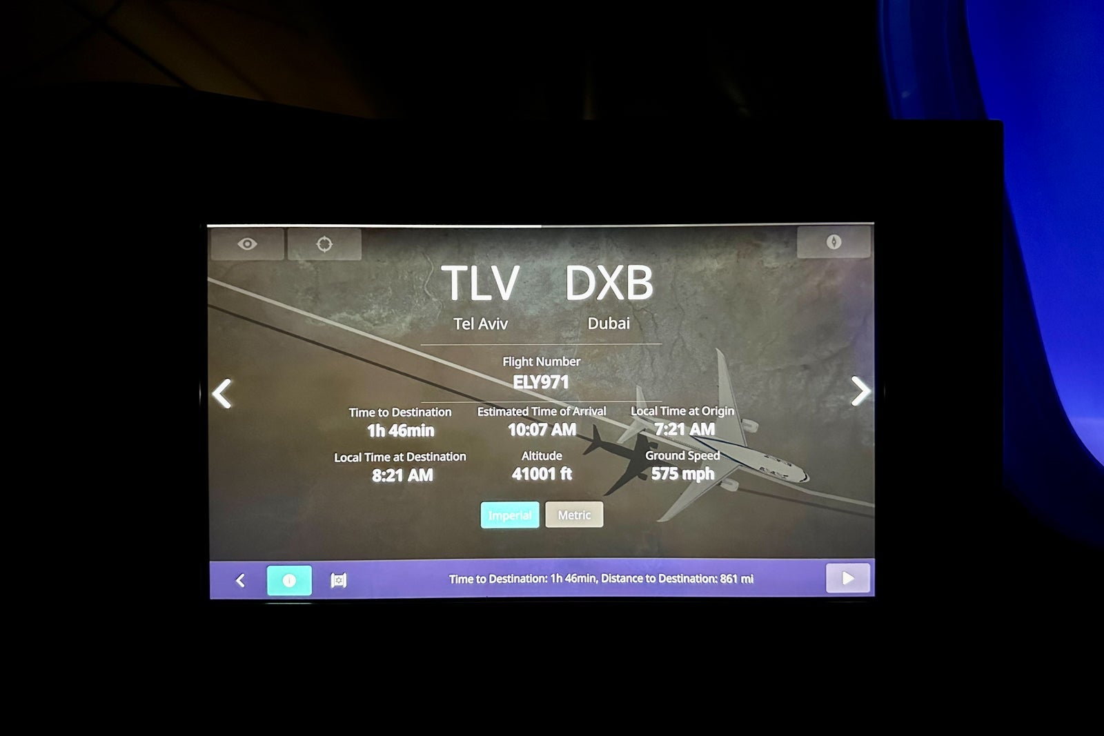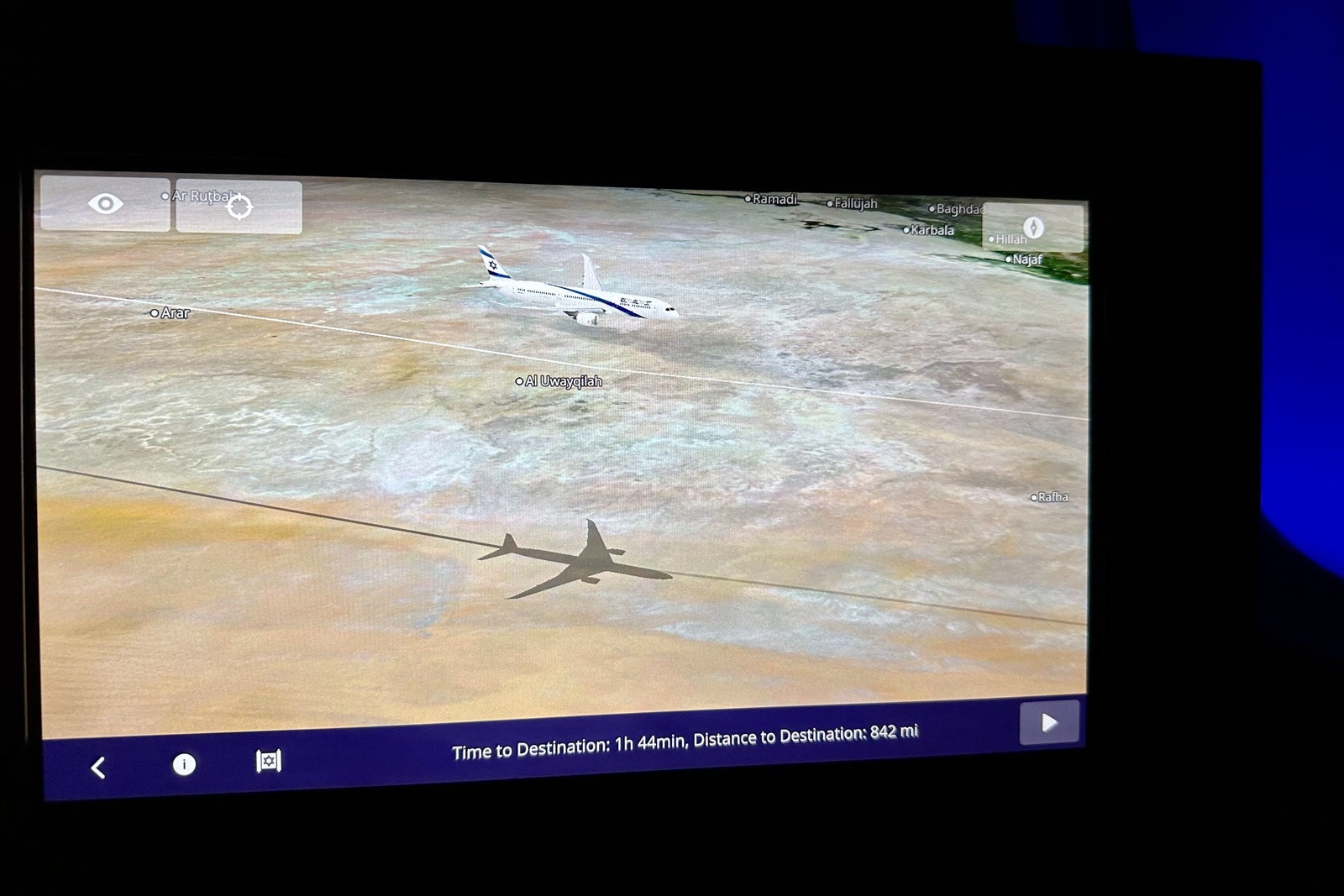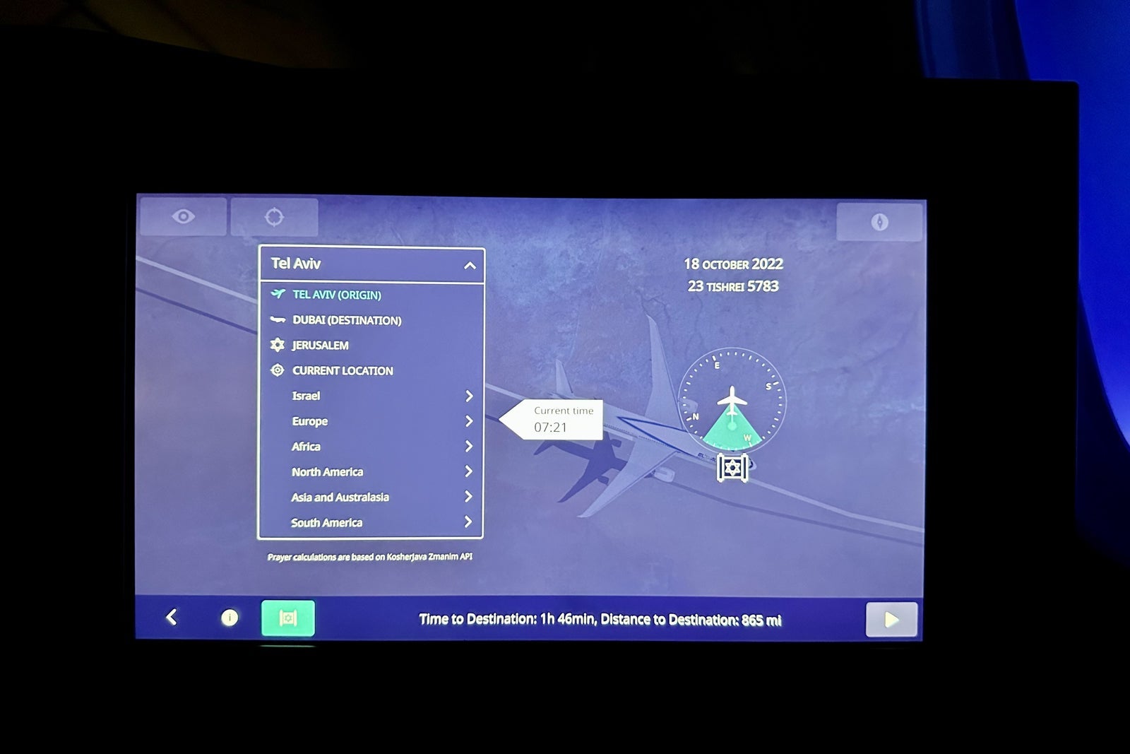Each seat is equipped with a high-definition entertainment screen, which is loaded with a selection of movies, TV shows and games. The moving map is highly customizable, and it even features a new view that displays Jewish prayer times according to the aircraft's present location.