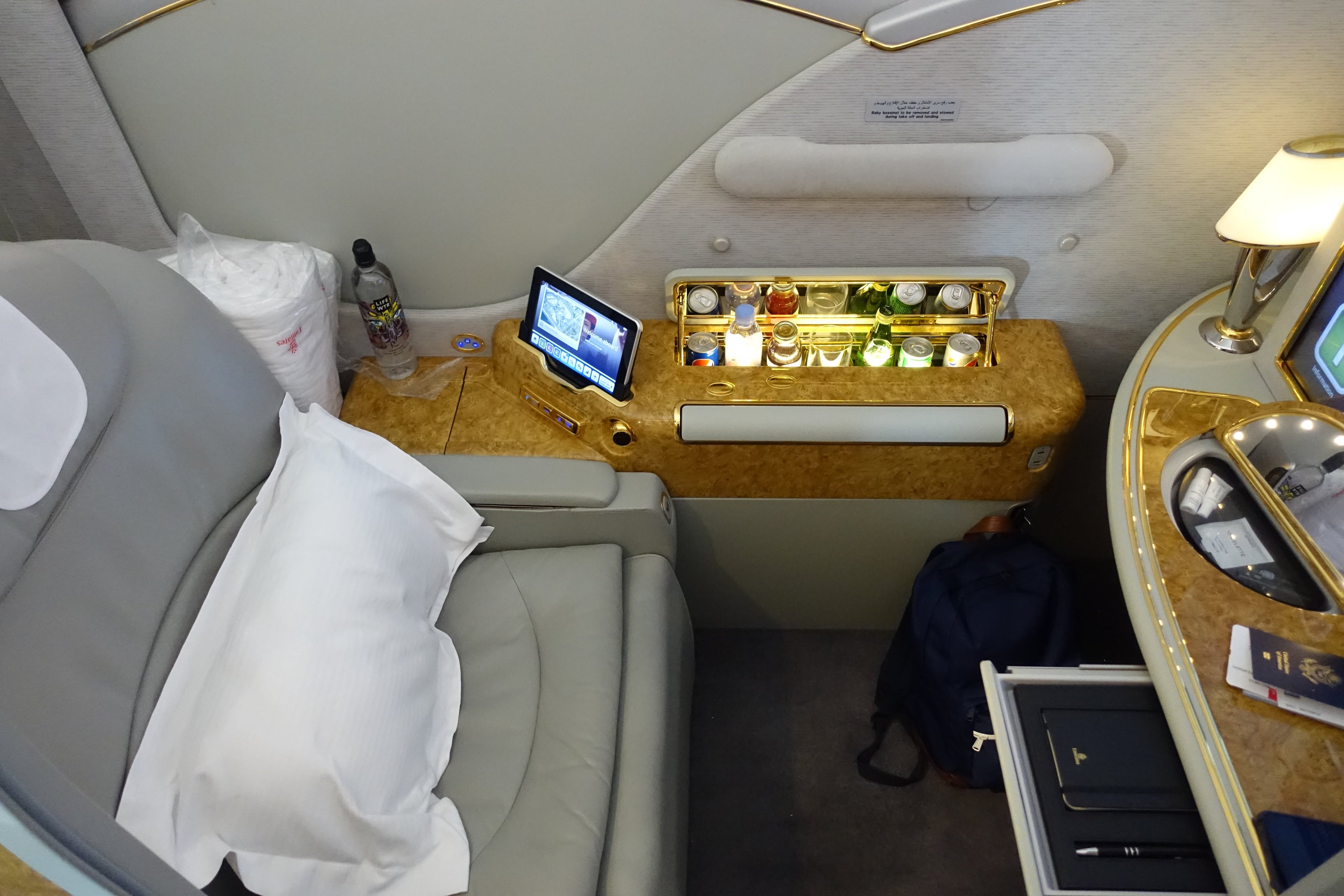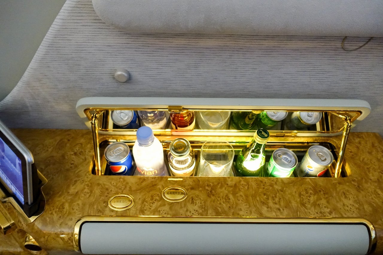 With so much space, there was plenty of room for Emirates to splurge on its first-class passengers. Take, for example, the "minibar" within the seat. It came stocked with pretty much any soft drink you could conceivably want on your 12ish-hour flight to Dubai. (It's not refrigerated, though.)