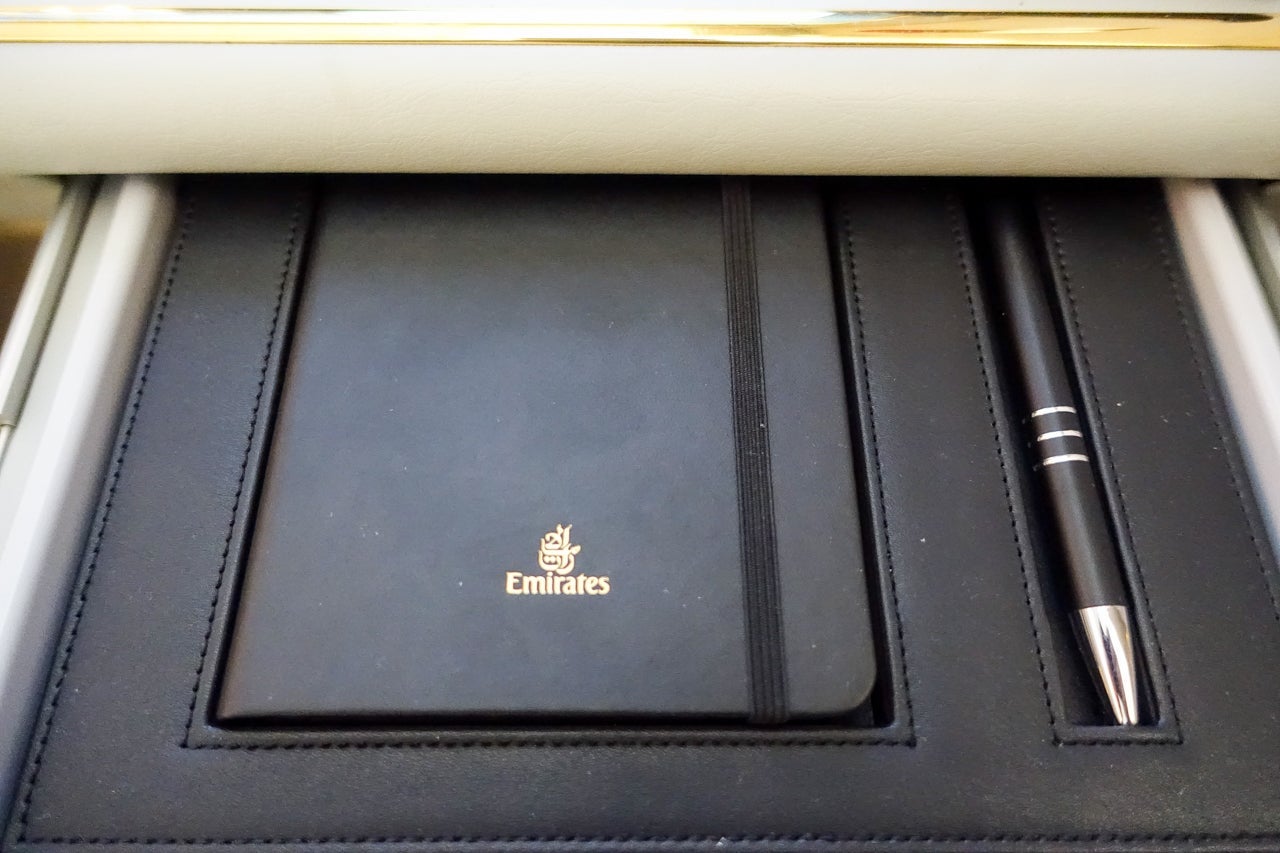 Behind the seat itself were a large, rolled-up mattress pad and full-size pillow, and under the IFE screen was an Emirates-branded bag that included a set of pajamas, slippers and the amenity kit.