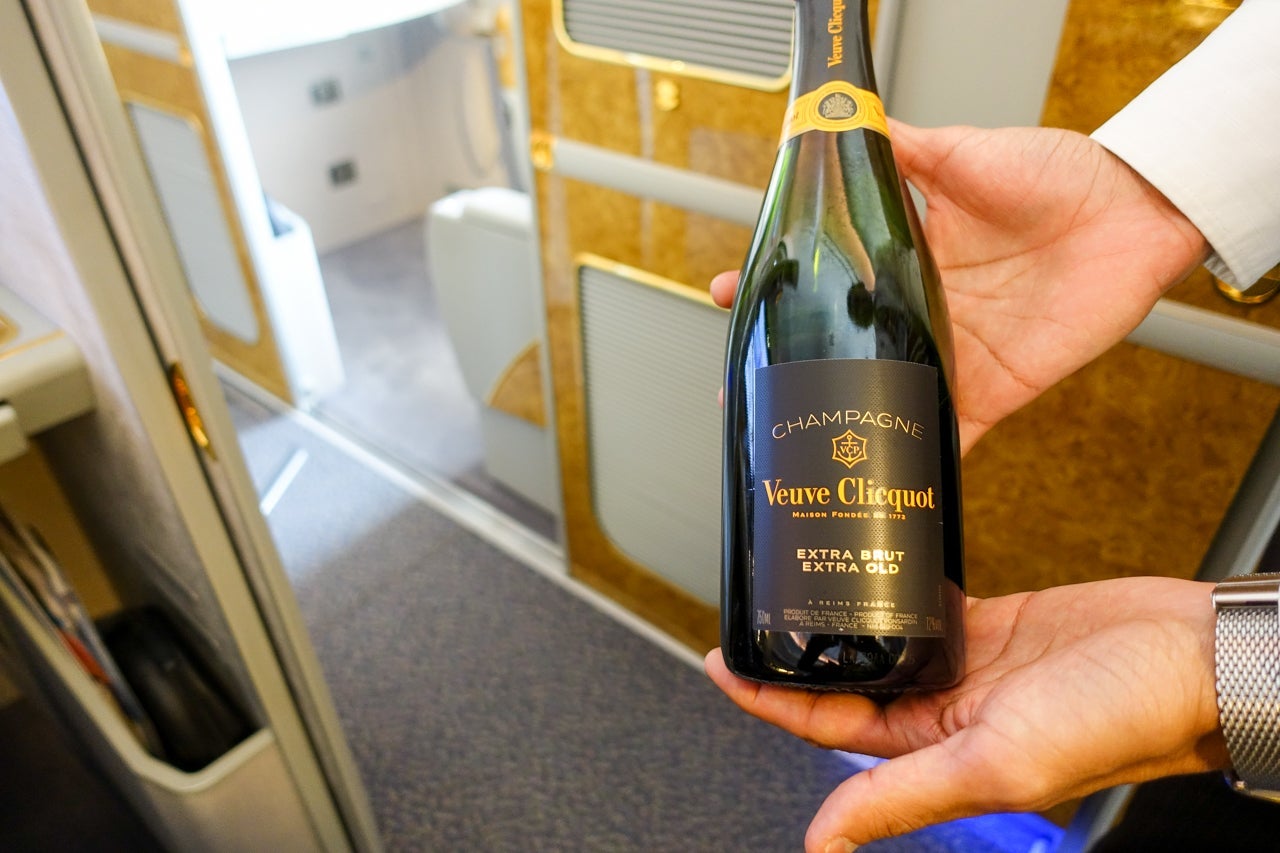 The indulgence began as soon as I got on board. The flight attendant assigned to my suite came up to me right away and offered me a glass of Champagne, which I accepted with gusto. I'd been waiting for this. We'd have to wait for takeoff for the Dom to start flowing, but I will not complain about two glasses of Veuve Clicquot extra brut while settling in.