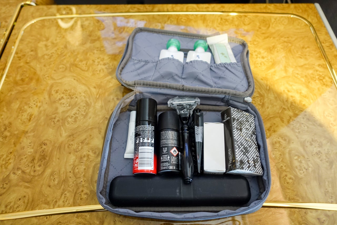 The kit itself was made of attractive, gray leather — quite a contrast to everything else at the seat that was full Emirates bling. Inside were various Bulgari amenities as well as a shaving kit, tissues, toothbrush, toothpaste and lip balm.