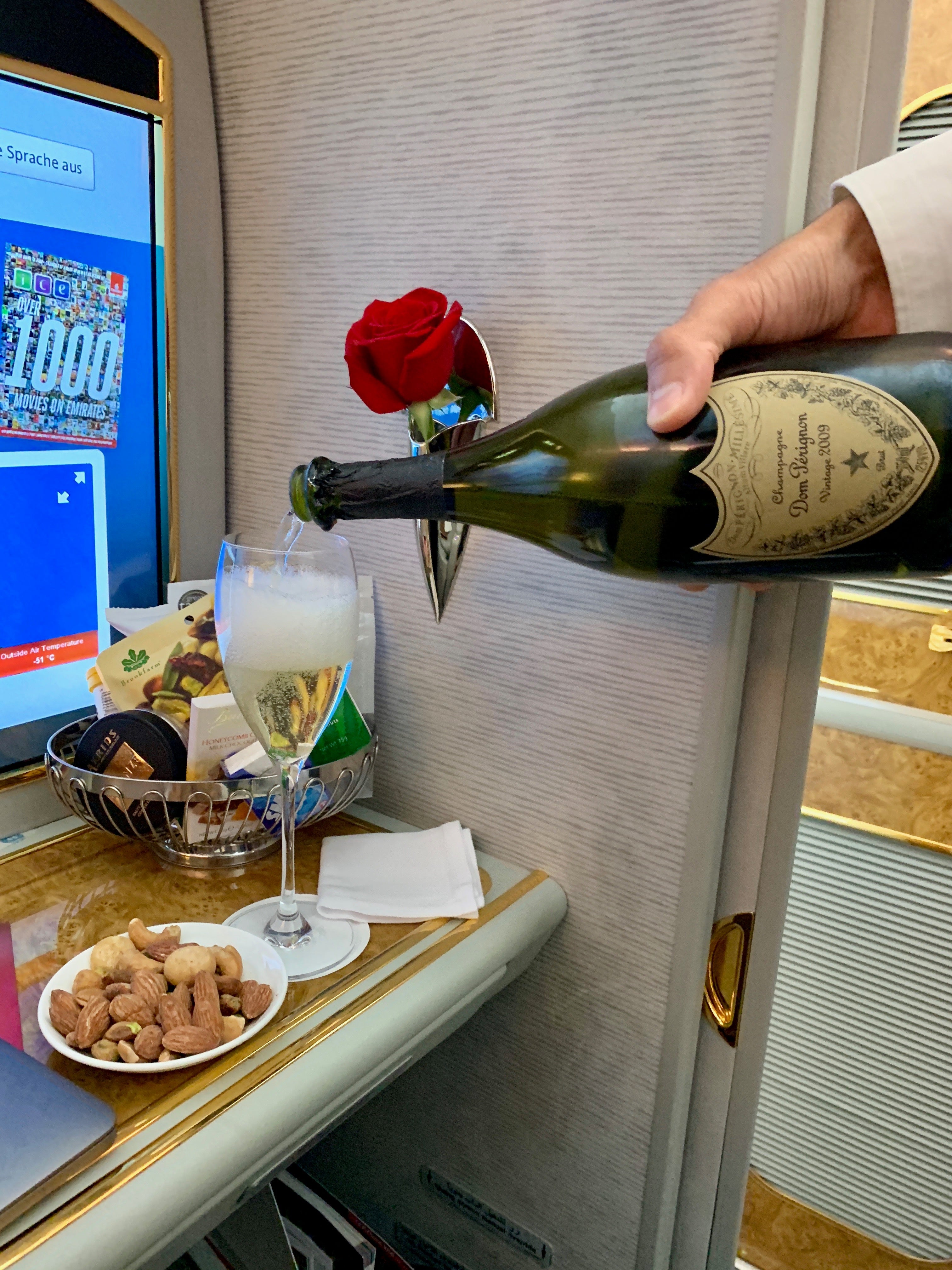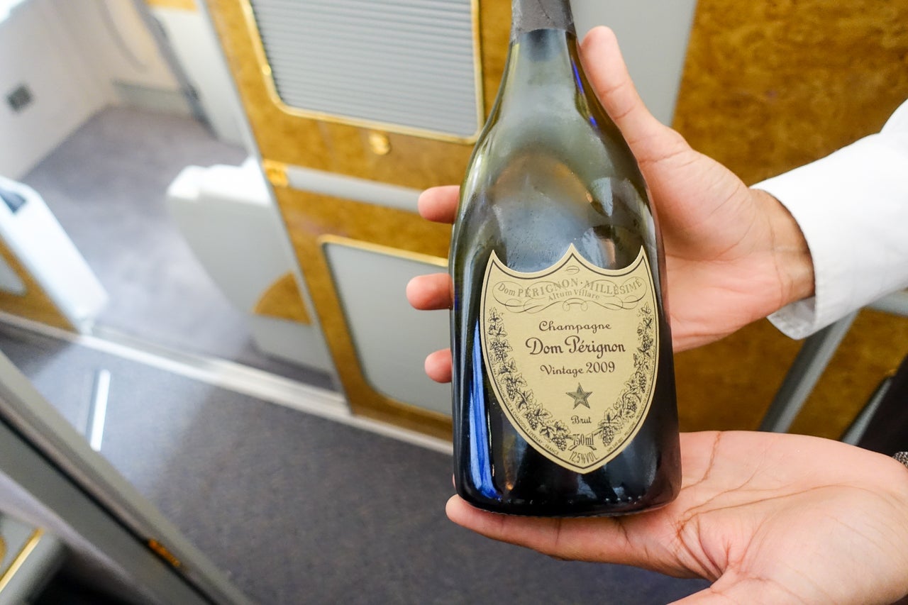 As soon as the mighty A380 leveled off after its ascent, the FA assigned to me promptly showed up at my seat with the main attraction: the Dom Perignon vintage 2009, which retails for ~$180 on the ground. I accepted the Dom with even more gusto and sipped away while I was still exploring all my suite had to offer.