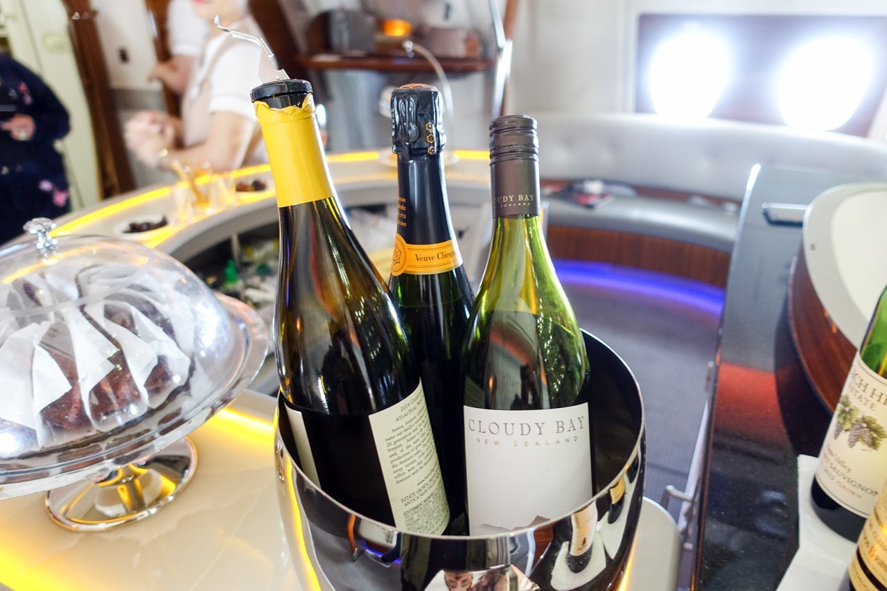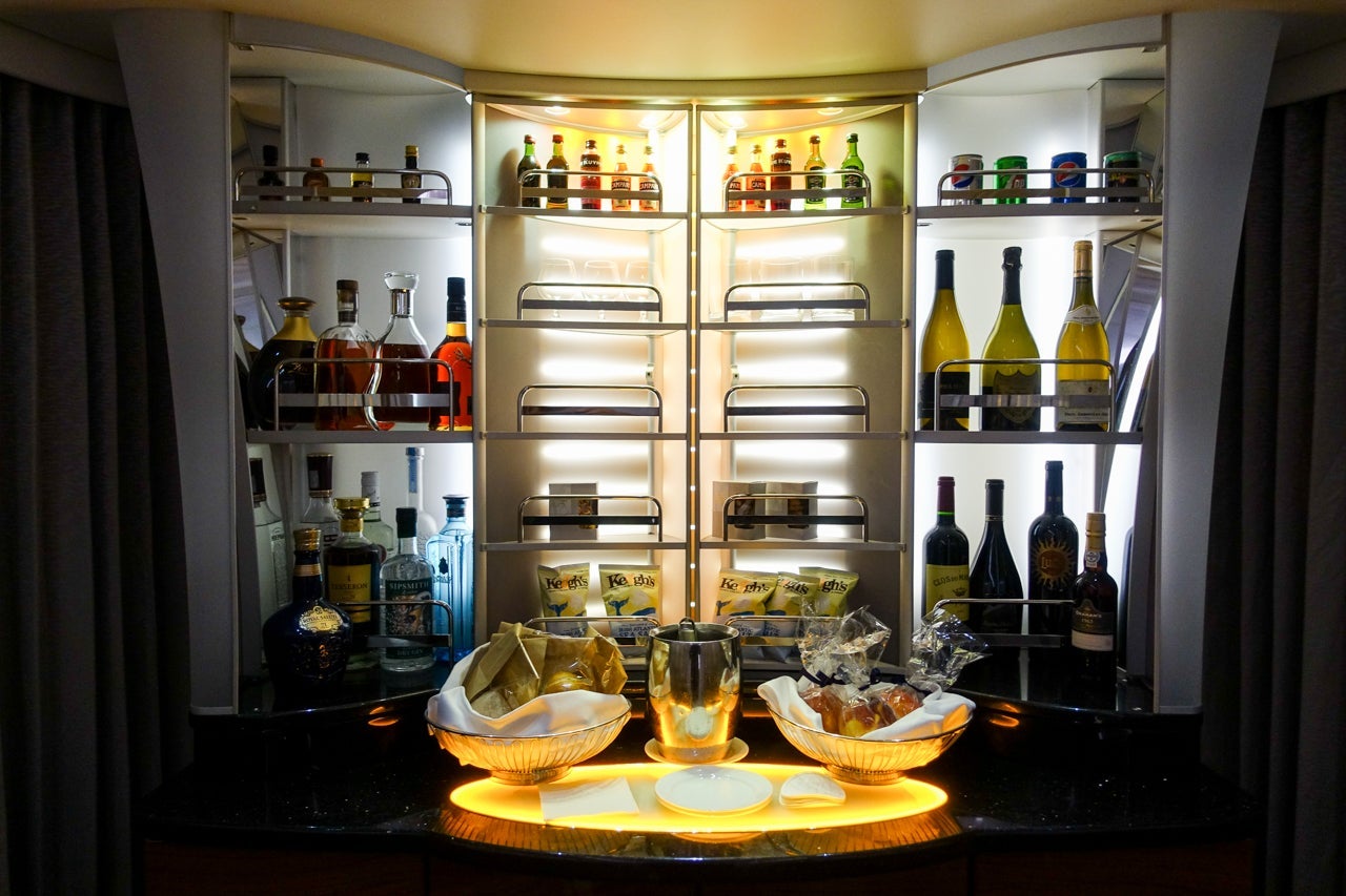 In addition to the full bar at the back of business class was a smaller self-serve bar at the front of the first-class cabin, right at the top of the stairs and between the two lavatories. This bar didn't just have water and Coca-Cola, either. It was fully stocked with high-end booze, including the Dom Perignon.