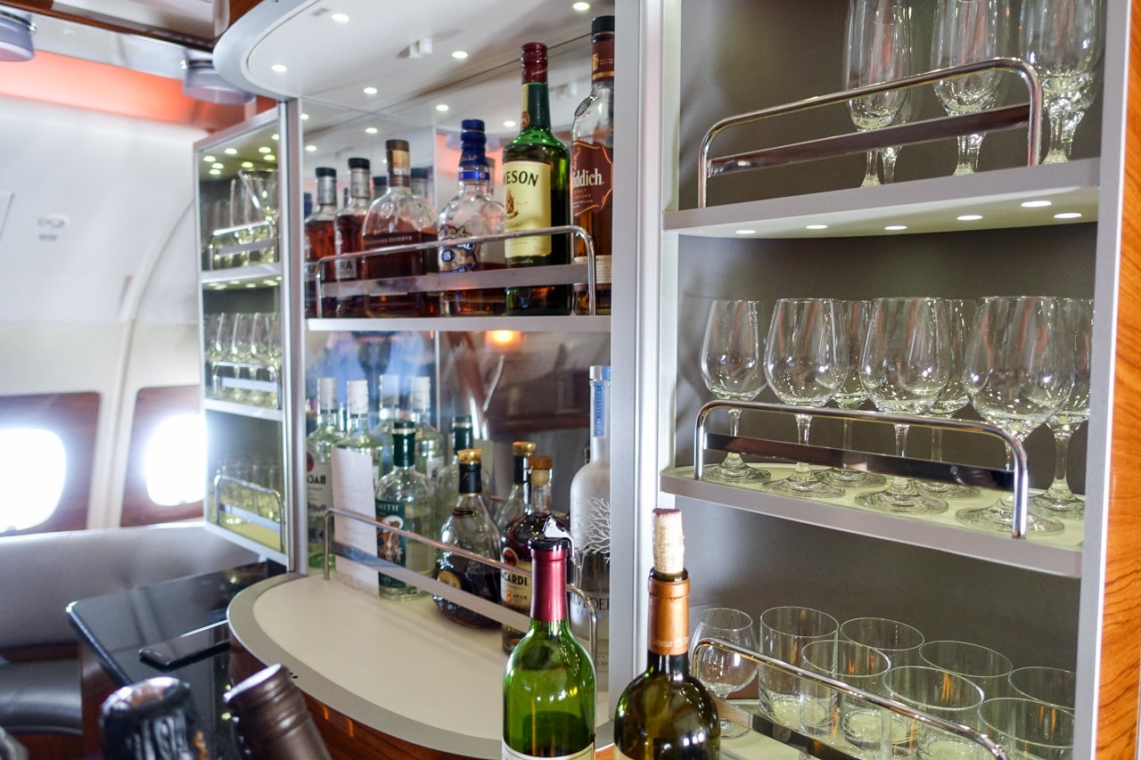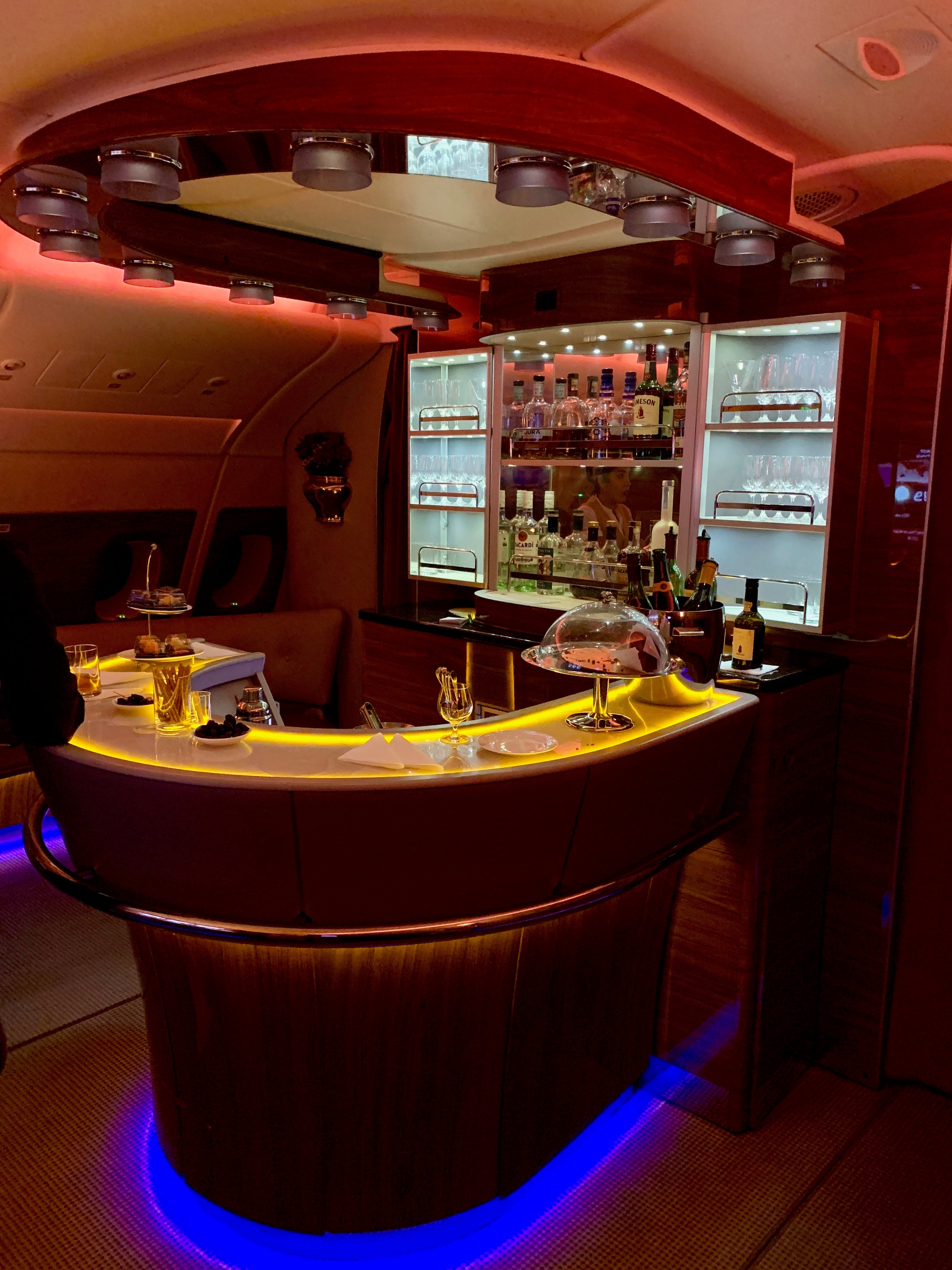 After exploring all there was to explore in and around my suite, it was time to explore the aircraft a little more, as there were two standout amenities that really completed the experience. One, the onboard bar: It was on the upper deck at the back of the business-class cabin, and was fully stocked and staffed with bartenders! I'd heard so much about this magical place from other TPGers who have flown with Emirates in either business or first, and was elated to have the chance to check it out for myself.