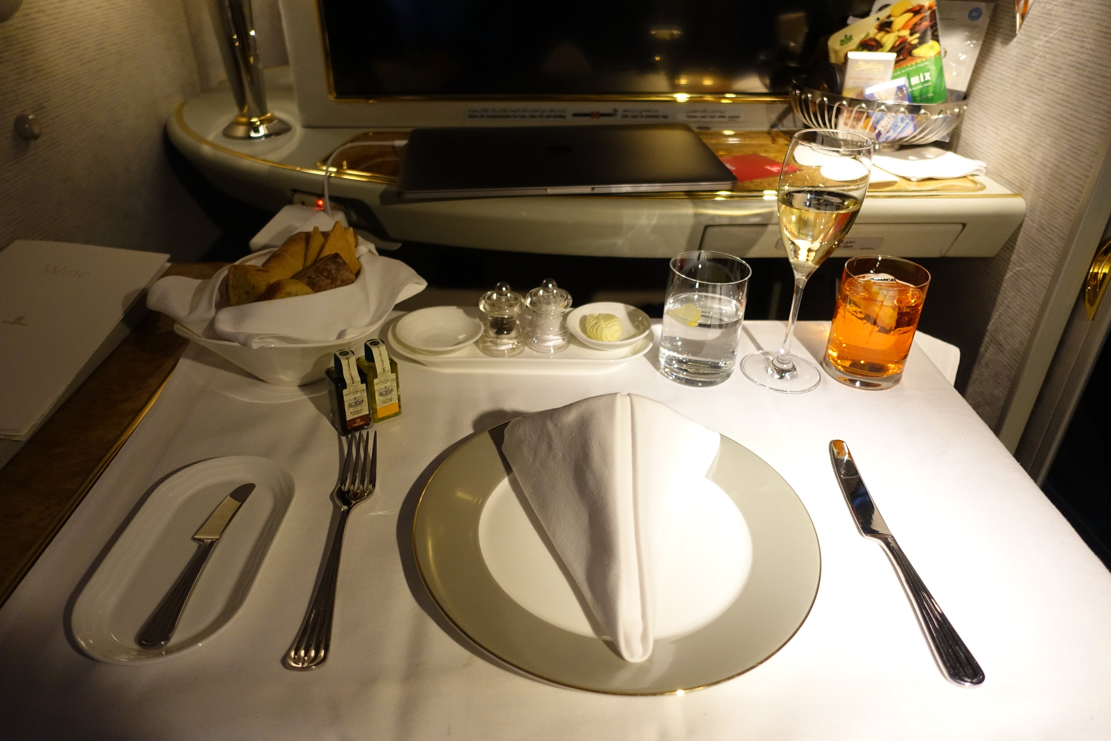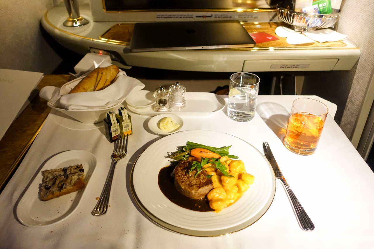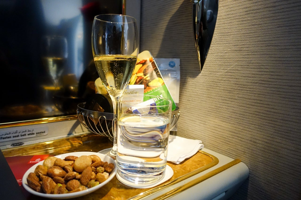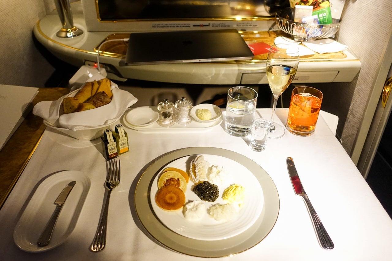 To put it simply, Emirates offered its first-class passengers a ton of options for food and drink. On the liquid side of things, I could pick from five different flavors of juice, five mocktails, eight soft drinks, five flavors of hot tea and five types of coffee. And that's just the stuff without alcohol. Listed in the menu were 12 cocktail choices: bloody Mary; classic Champagne cocktail; Aperol spritz; kir royale; cosmopolitan; Manhattan; classic martini; breakfast martini; espresso martini; mojito; old fashioned and negroni.