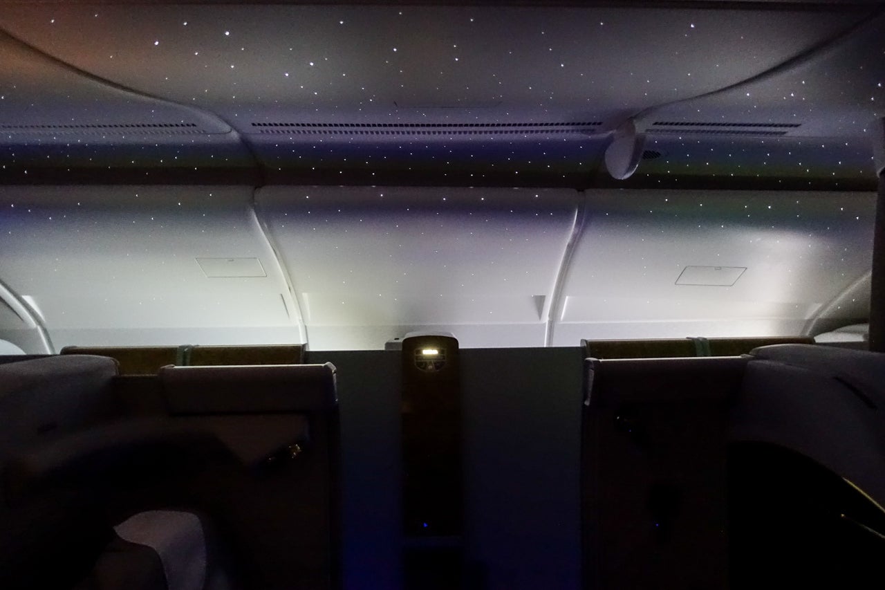 When the cabin lights were dimmed, the ceiling lit up as if to mimic the night sky, with LED stars dotting the top of the whole cabin. I tried in vain to sleep, but instead I just stargazed for a couple of hours before returning the seat to a lounging position and watching movies and attempting to work.