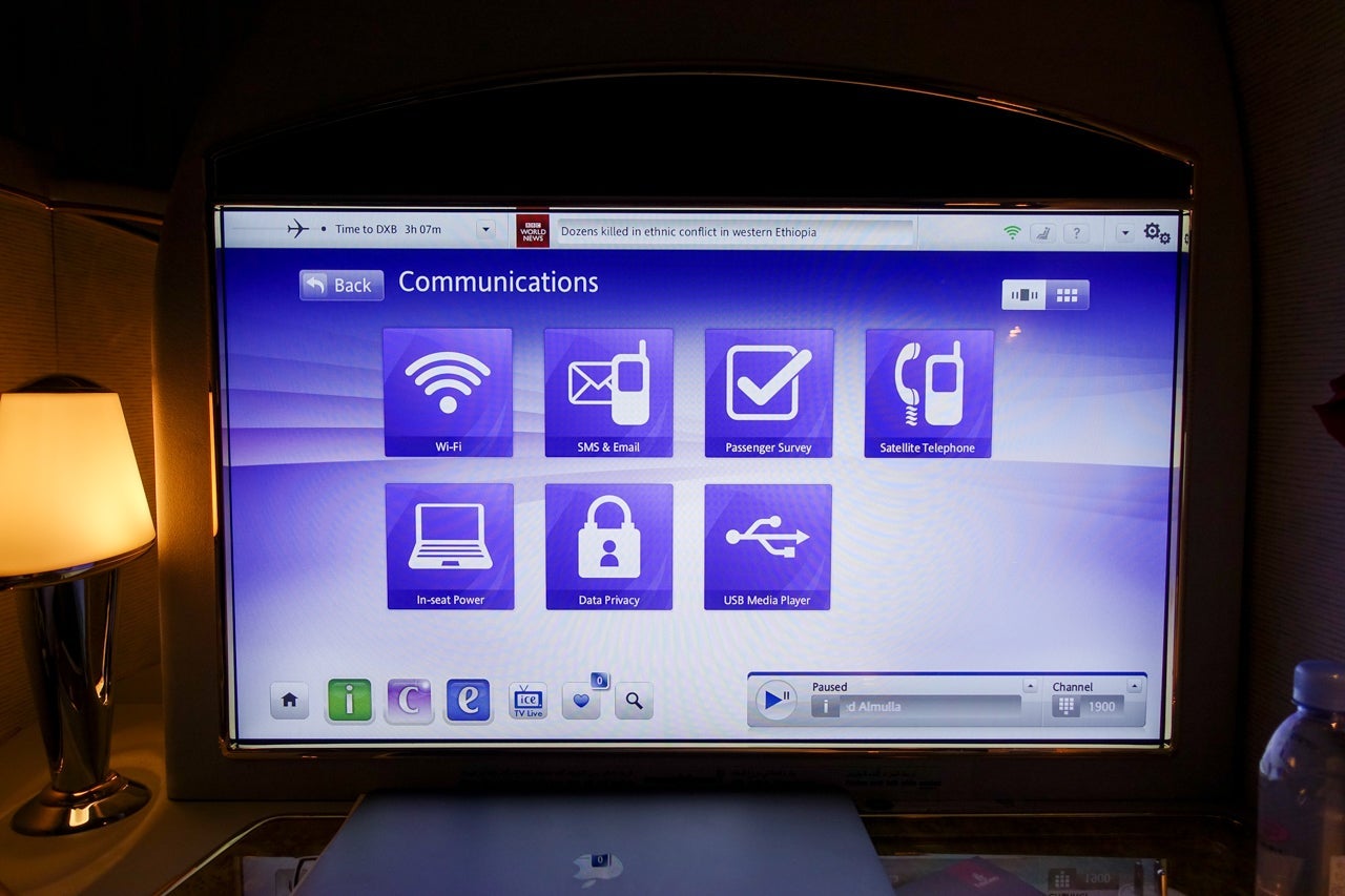 One area which could certainly have been improved upon was the Wi-Fi. The first strike was completely my fault. I hadn't realized that Emirates offered free Wi-Fi in first class to its Skywards members (I am one). However, when I made my reservation, I neglected to input my Skywards number, since it was an award ticket and I figured that I couldn't earn miles for the trip, so what was the point of adding my number? Lesson learned: Always put your frequent-flyer number in when you make reservations, even if you're traveling on an award ticket.