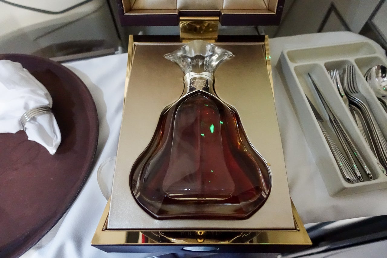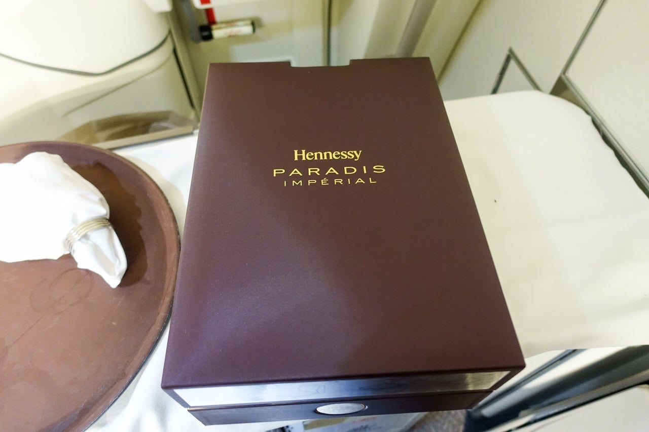 On my way back from the bar to my seat, one FA stopped me and asked if I wanted to try a "special" Hennessy. At first I was hesitant, as the last thing I needed was another drink. But she persisted, and I relented. She pulled down a heavy box containing a bottle of Hennessy Paradis Impérial and poured me a glass. This was the really good stuff, and it was so refreshing to see a crew with so much pride in their product that they pulled out all the stops to impress me.
