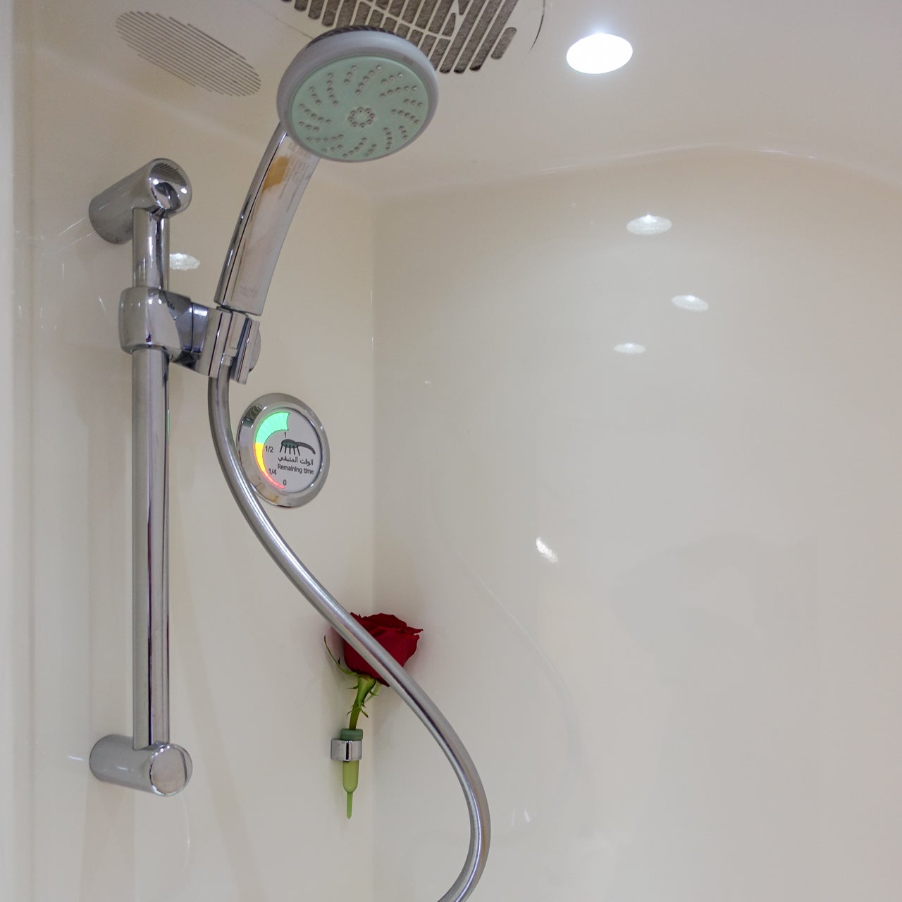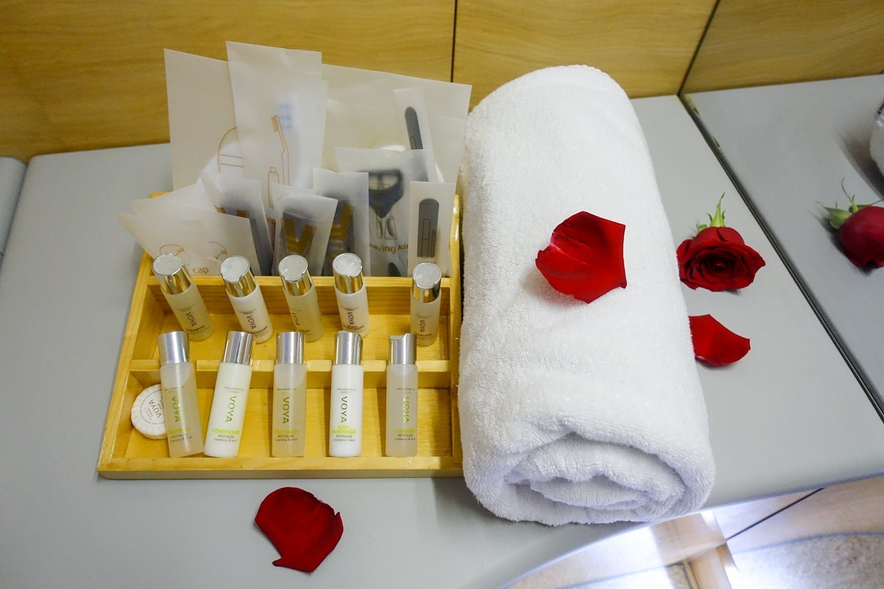 I reserved a time slot about 90 minutes before landing so I'd have enough time to utilize the shower and then get back to my seat to have a small snack and pack up all my belongings before landing. Once it was time, my FA brought me to the lavatory, where another attendant was waiting to explain to me how it all worked. She pointed out the features of the lavatory, including where the toiletries were, and then moved on to explain that I'd have five minutes of shower time, and that most people turn the water off and on as they're showering so as to not run out.