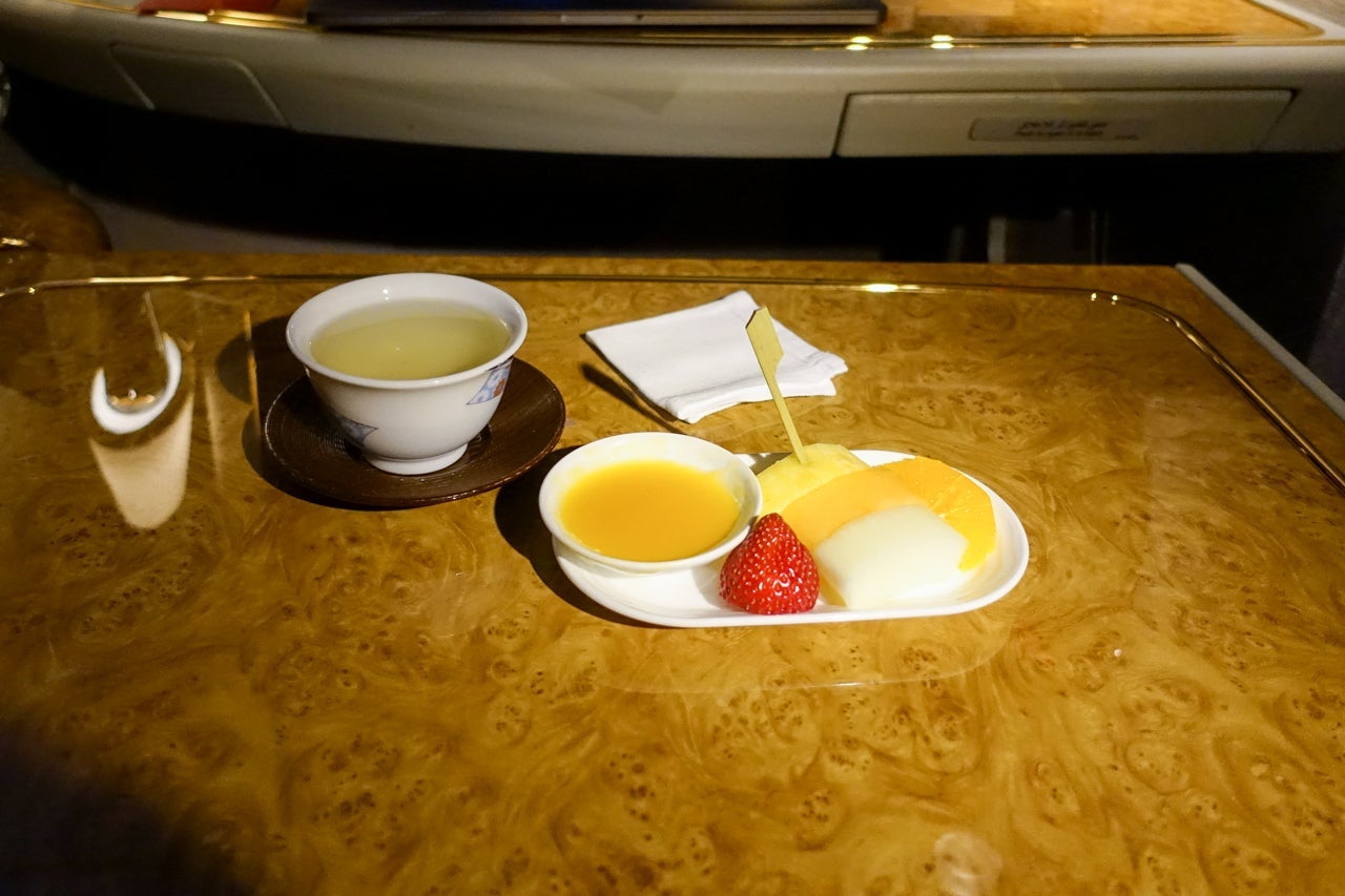 After that meal, I was really, truly, actually stuffed, so I refrained from eating for just about the entirety of the rest of the flight, though I did ask for a small plate of fruit and a cup of green tea about an hour before landing, which was a perfect way to end the flight, given that it was still very early in the morning in Dubai.