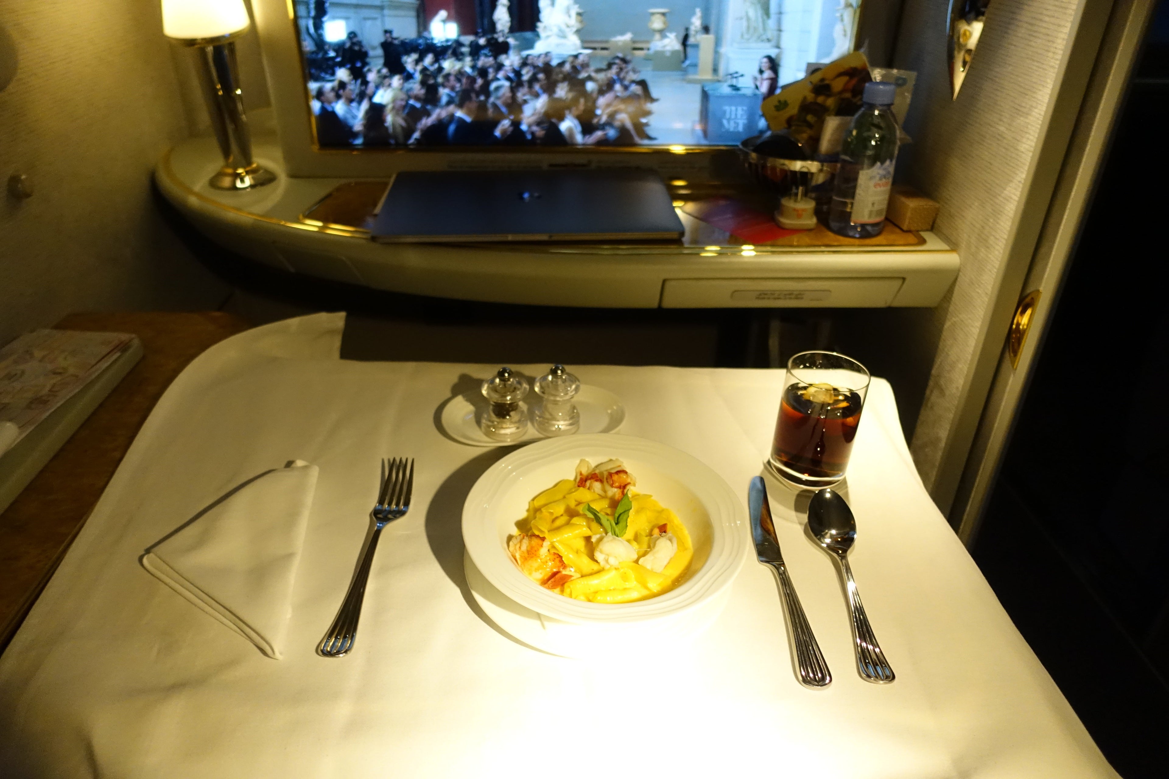 [flight_stats ticket-class="first" review-stat-section="Food and Beverage" tpg-rating="23" tpg-rating-max="25" live-tv="0" tailcam="0" headphones="0" champagne="Veuve Clicquot/Dom Perignon" dine-on-demand="Yes" comp-alcohol="0" extra-pillows="0" turndown-service="0" /]