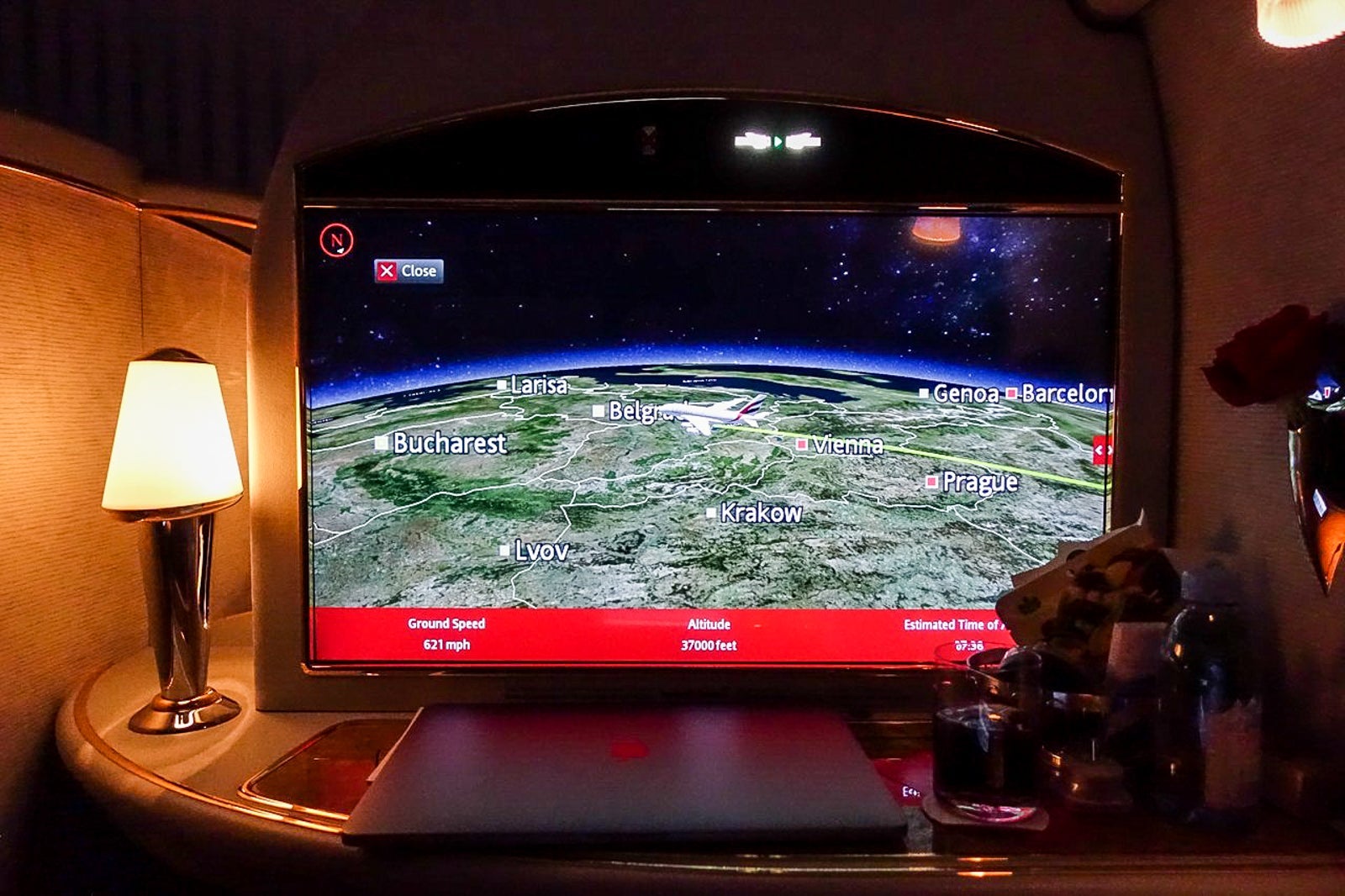 [flight_stats ticket-class="first" review-stat-section="Amenities and IFE" tpg-rating="13" tpg-rating-max="15" screen="32" live-tv="Yes" tailcam="Yes" wifi="0.17" wifi-2="0.09" headphones="0" comp-alcohol="0" extra-pillows="0" turndown-service="0" /]