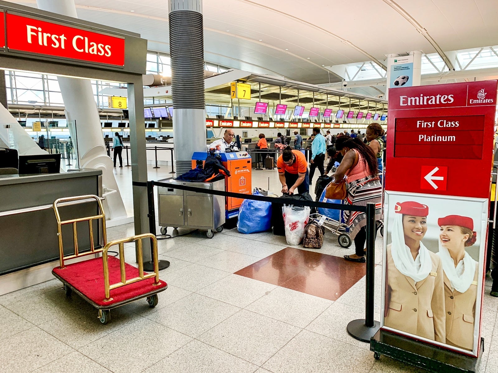 I arrived at JFK's Terminal 4 just after 7:30am and headed straight to the Emirates first-class check-in booth, away from the business-class and economy check-in areas. I bade my too-large suitcase adieu, collected my boarding passes and was on my way. It was still quite early, so the TSA PreCheck line was short and I was on the other side in just a few minutes.